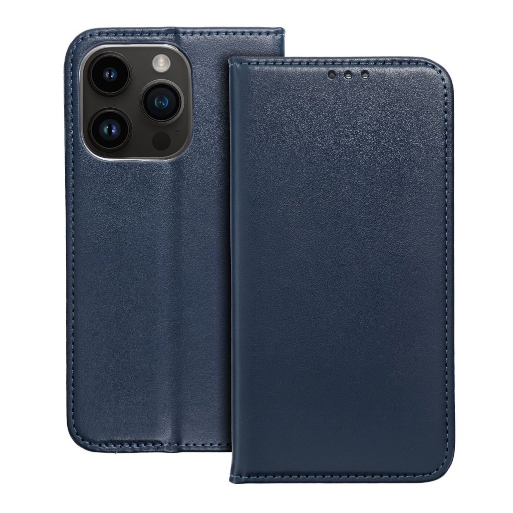 Peňaženkový obal SMART MAGNETO Book pre IPHONE 15 Plus tmavo modrý s magnetickým zapínaním je klasické puzdro na telefón s funkciou peňaženky a stojana na TV. Je vyrobené z metalizovaného materiálu, podšité mäkkou tkaninou, ktorá chráni obrazovku pred poškriabaním.