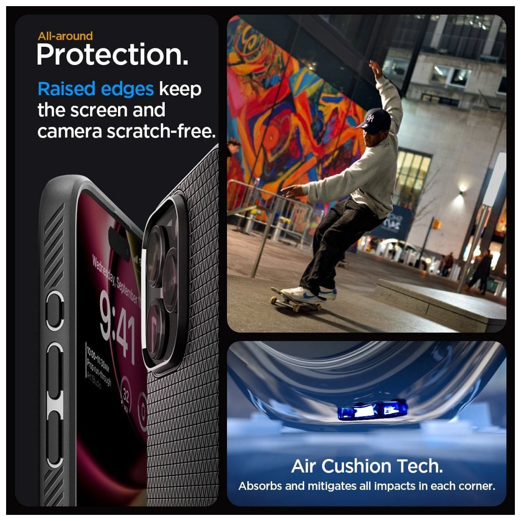 Tento elegantný kryt SPIGEN LIQUID AIR pre IPHONE 15 Pro Max matný čierny ponúka všetko, čo od ochranného puzdra na mobilný telefón požadujete. Toto precízne spracované puzdro je vyrobené z matného a odolného termoplastu, má mierne vyvýšené hrany okolo obrazovky aj fotoaparátu a v rohoch je vystužené pomocou technológie Air Cushion. Ponúka tak naozaj vysoko kvalitnú ochranu telefónu, ktorá je navyše doplnená o krásny a nadčasový dizajn s geometrickým vzorom, ktorý funguje aj ako ochrana proti vykĺznutiu telefónu z ruky a nezostávajú na ňom odtlačky prstov.