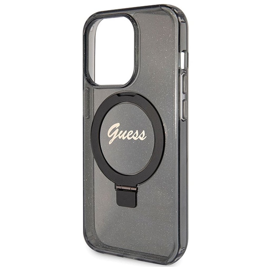Originálne puzdro GUESS GUHMP15XHRSGSK pre iPhone 15 Pro Max (Compatible with Magsafe / Glitter Script Logo / krúžok na prst / čierne)