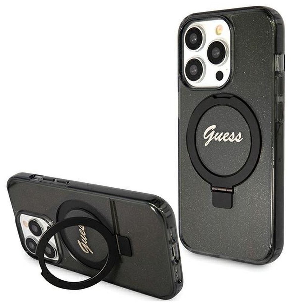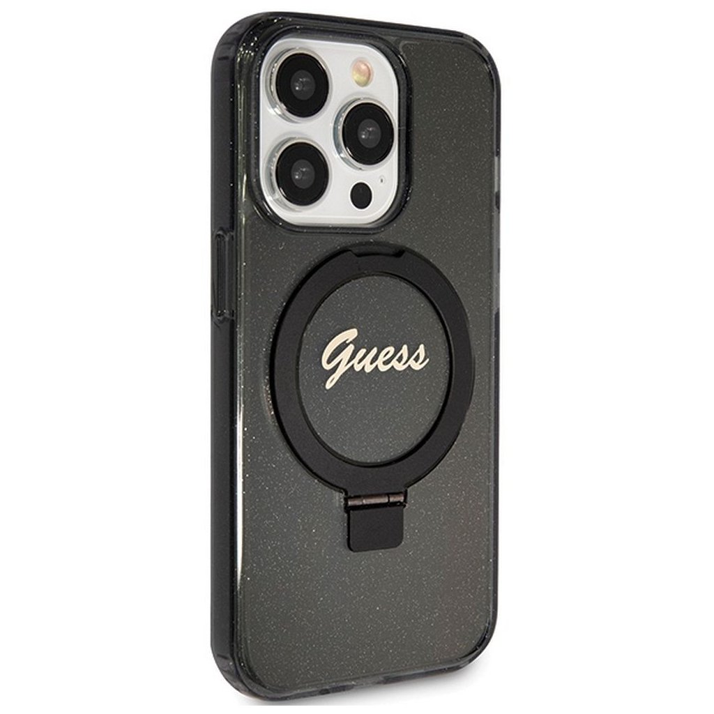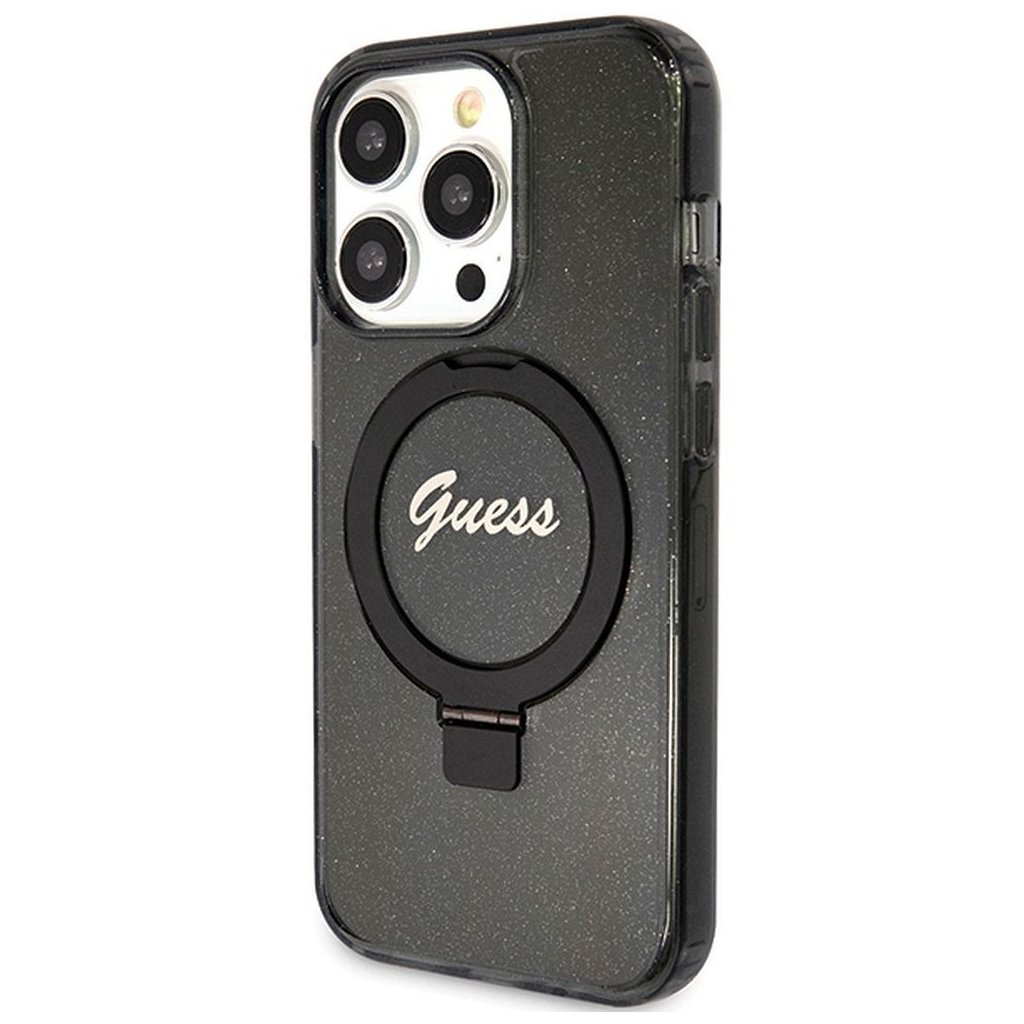 Štýlové a Originálne puzdro GUESS GUHMP15XHRSGSK pre iPhone 15 Pro Max (Compatible with Magsafe / Glitter Script Logo / krúžok na prst / čierne) je kvalitný obal na Váš telefón vyrobený z odolných materiálov, s prepracovanými detailmi a dizajnom.