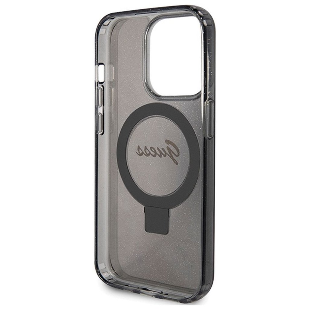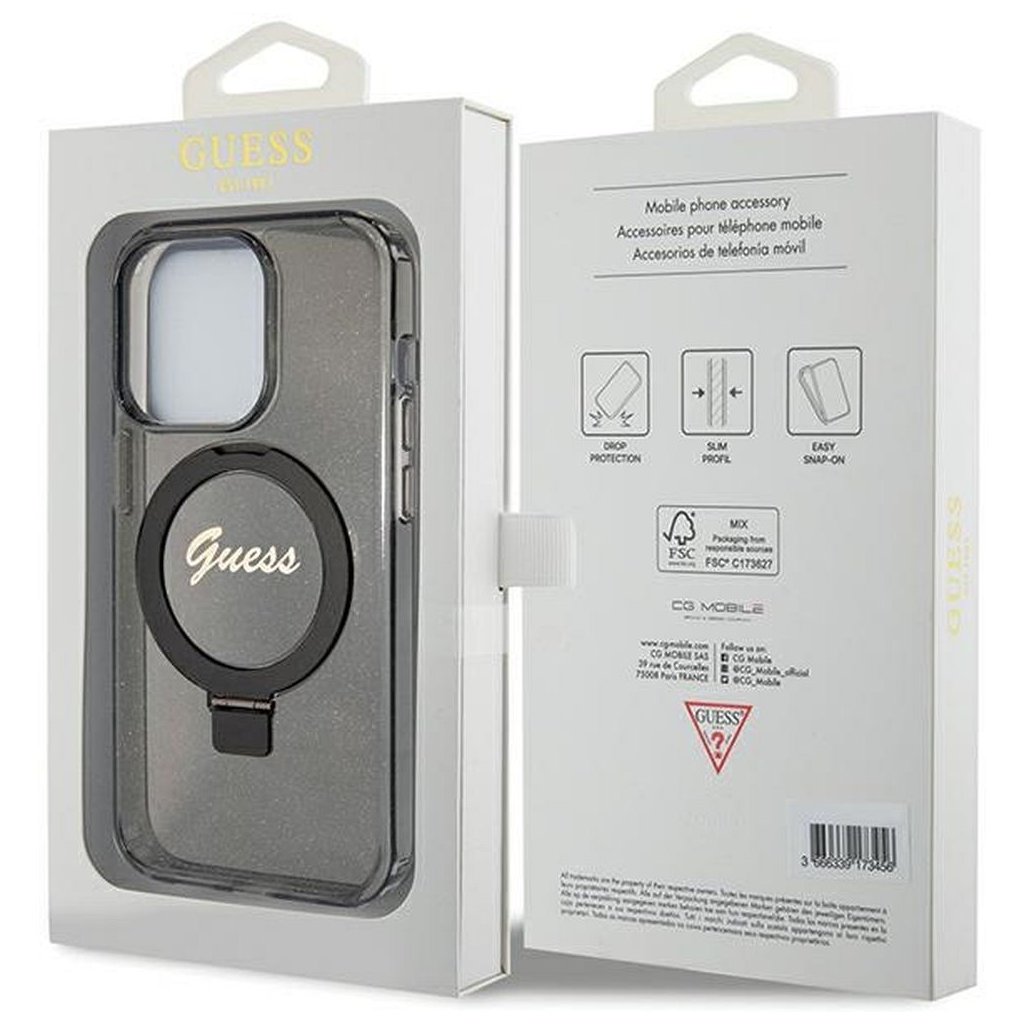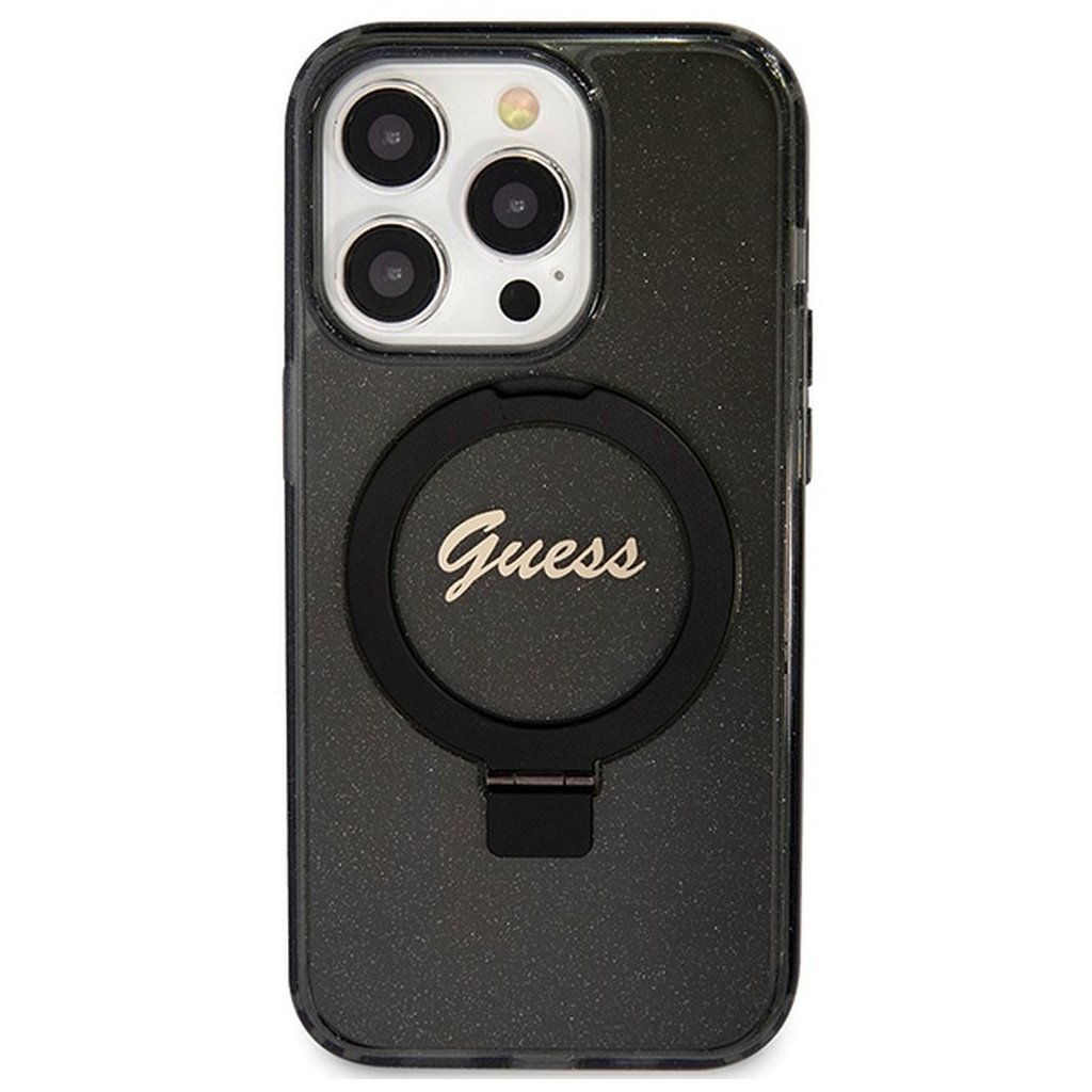 Štýlové a Originálne puzdro GUESS GUHMP15XHRSGSK pre iPhone 15 Pro Max (Compatible with Magsafe / Glitter Script Logo / krúžok na prst / čierne) je kvalitný obal na Váš telefón vyrobený z odolných materiálov, s prepracovanými detailmi a dizajnom.