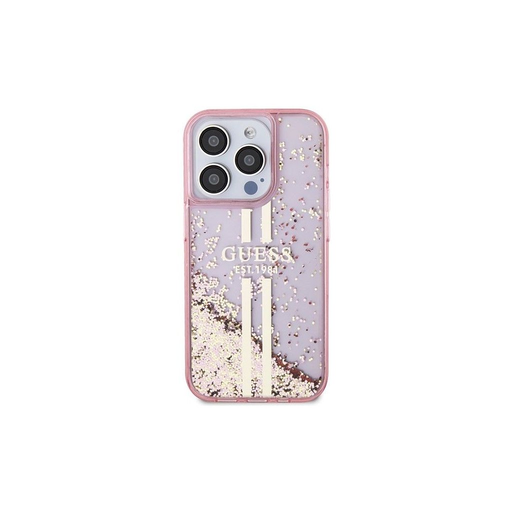 Štýlové a GUESS pre IPHONE 15 Pro GUHCP15LLFCSEGP (Liquid Glitter zlaté Stripes) ružové je kvalitný obal na Váš telefón vyrobený z odolných materiálov, s prepracovanými detailmi a dizajnom.