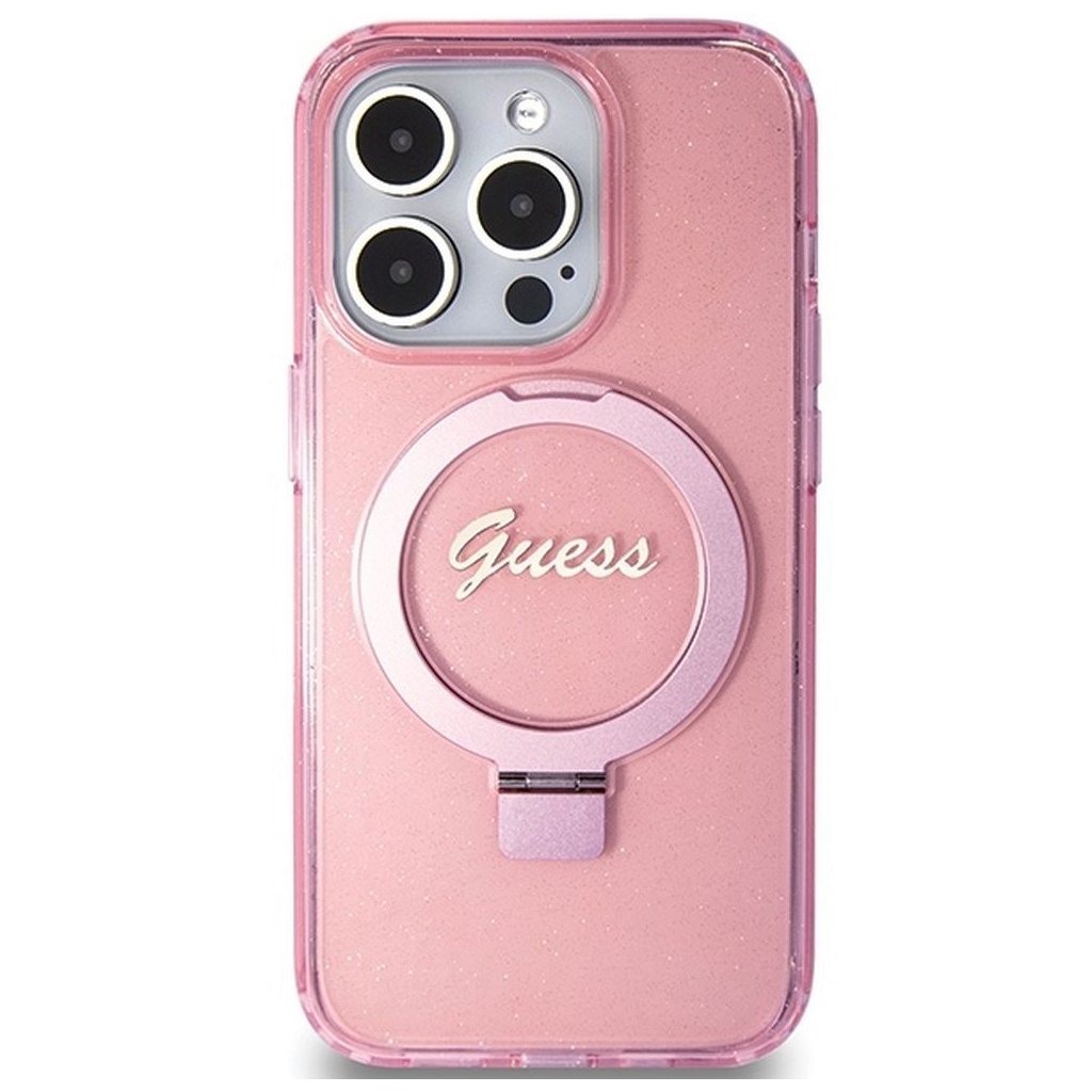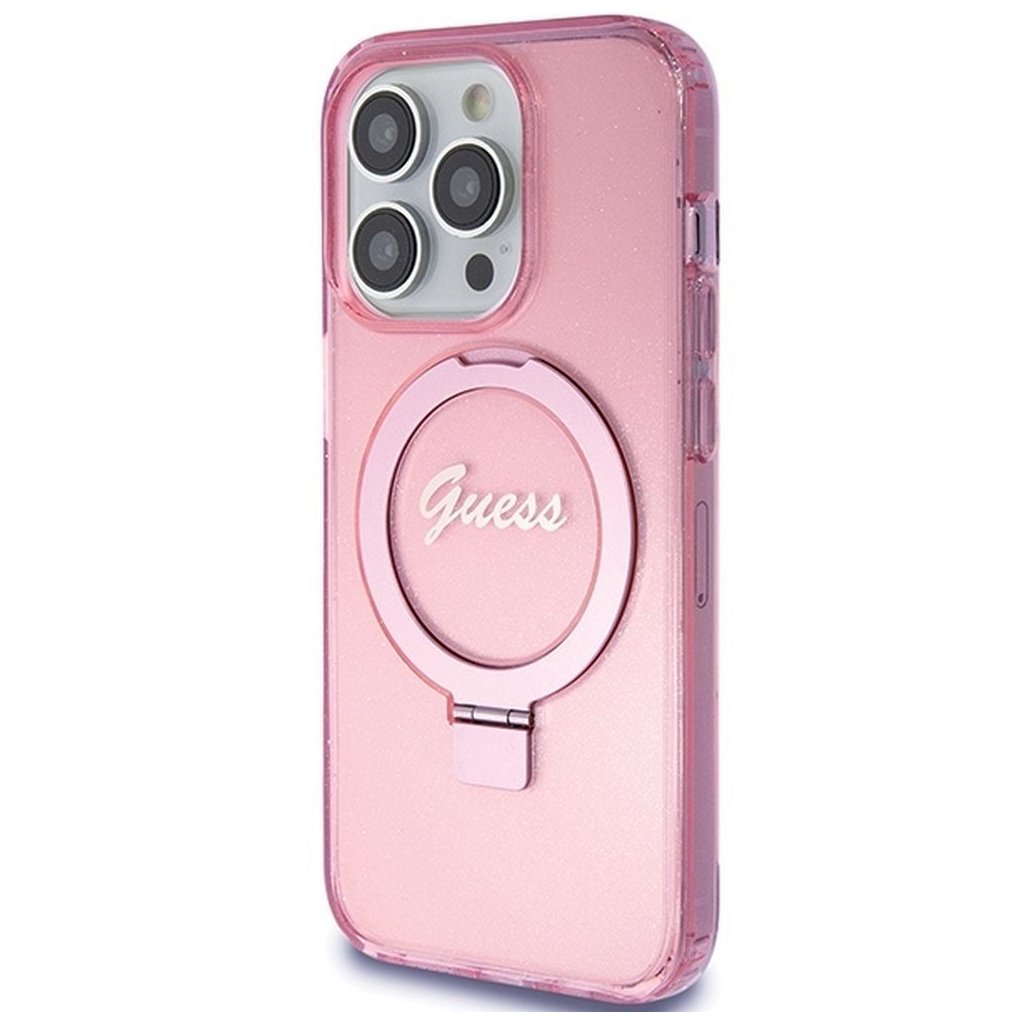 Štýlové a GUESS pre IPHONE 15 Pro s MagSafe GUHMP15LHRSGSP (Glitter Script Logo krúžok na prst) ružové je kvalitný obal na Váš telefón vyrobený z odolných materiálov, s prepracovanými detailmi a dizajnom.