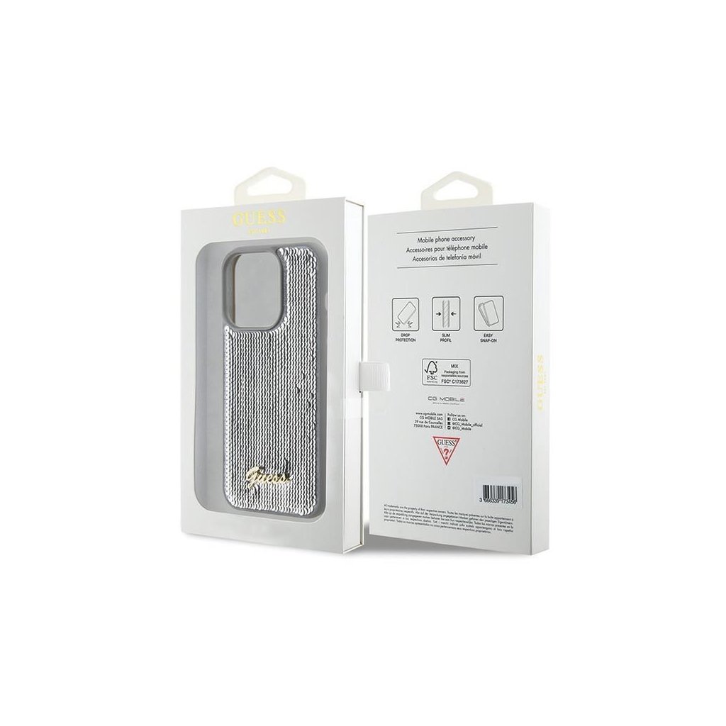 Štýlové a Originálne puzdro GUESS pre IPHONE 15 Pro GUHCP15LPSFDGSS (Sequin Script Metal) strieborné je kvalitný obal na Váš telefón vyrobený z odolných materiálov, s prepracovanými detailmi a dizajnom.