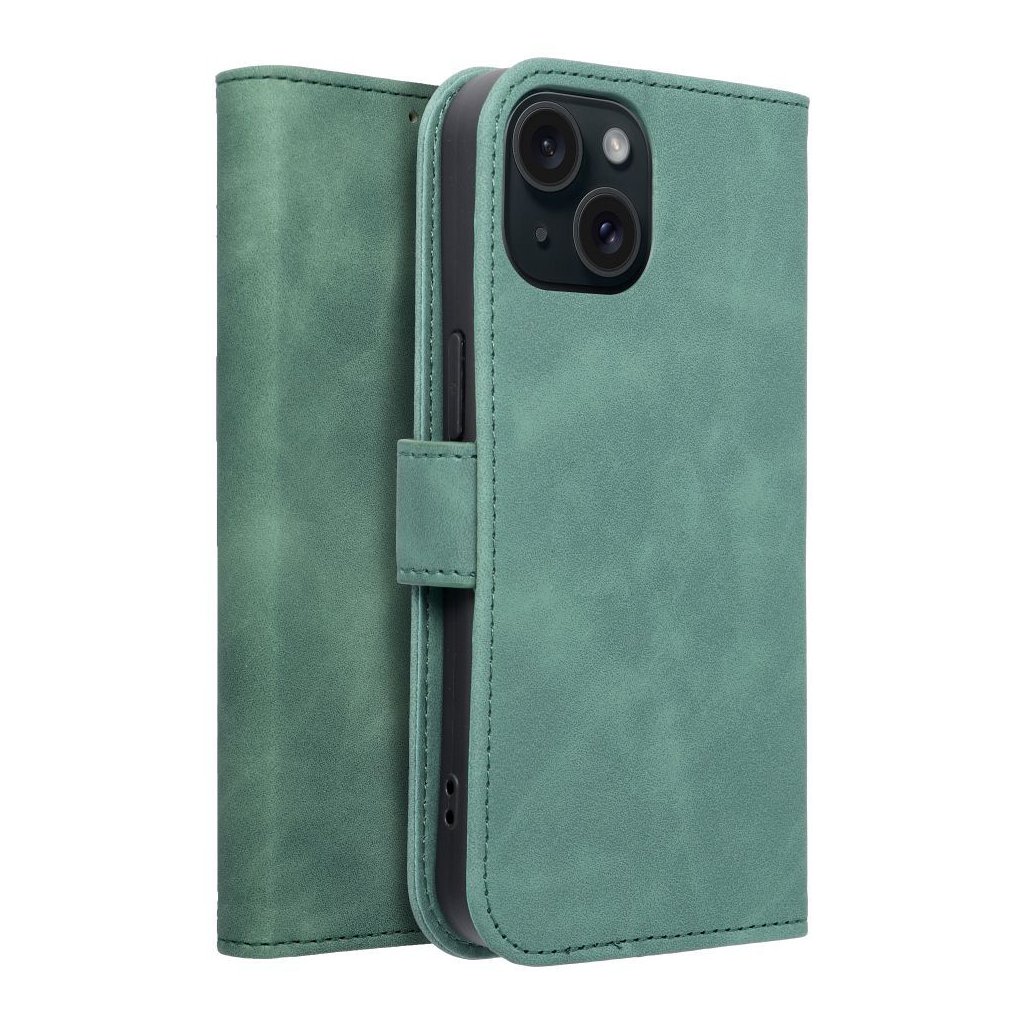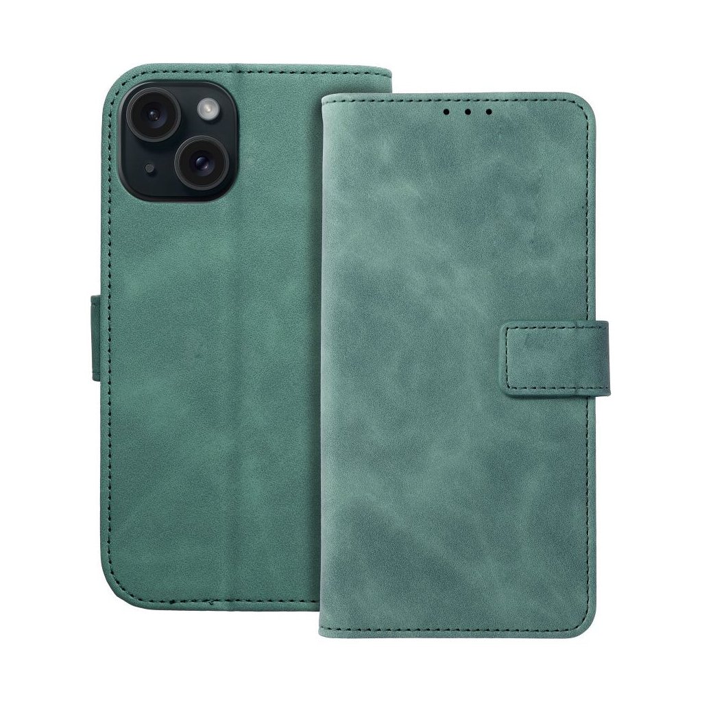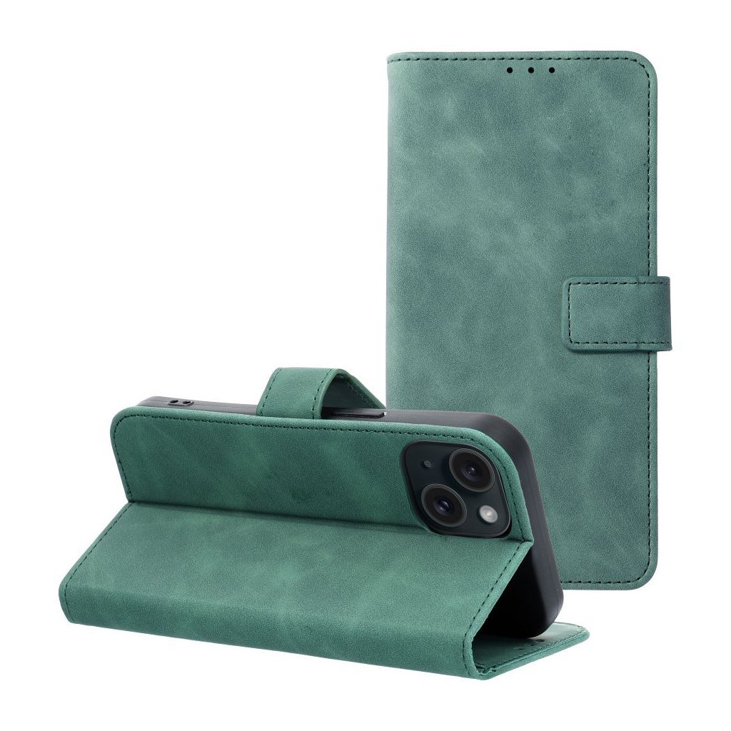 Zatvárací peňaženkový obal TENDER Book pre IPHONE 15 zelený v príjemnej imitácii kože v decentných farbách je ako stvorené pre každého, kto má skutočne štýl. Materiál je na dotyk veľmi príjemný a mäkký, telefónu ale poskytuje plnú ochranu zo všetkých strán.