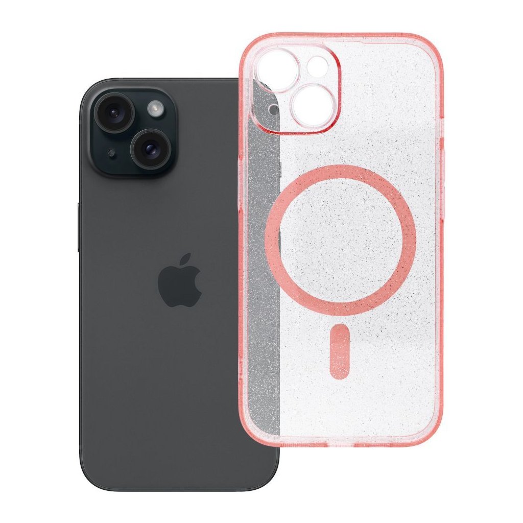 Priehľadný obal pre iPhone 15 Clear Mag Cover (STR / CAMERA PROTECTION) compatible with MagSafe ružový, ktorého odolná a priehľadná vrstva chráni Váš telefón pred nárazmi alebo poškriabaním. Produkt je kompatibilný s technológiou MagSafe, ktorá umožňuje indukčné nabíjanie.