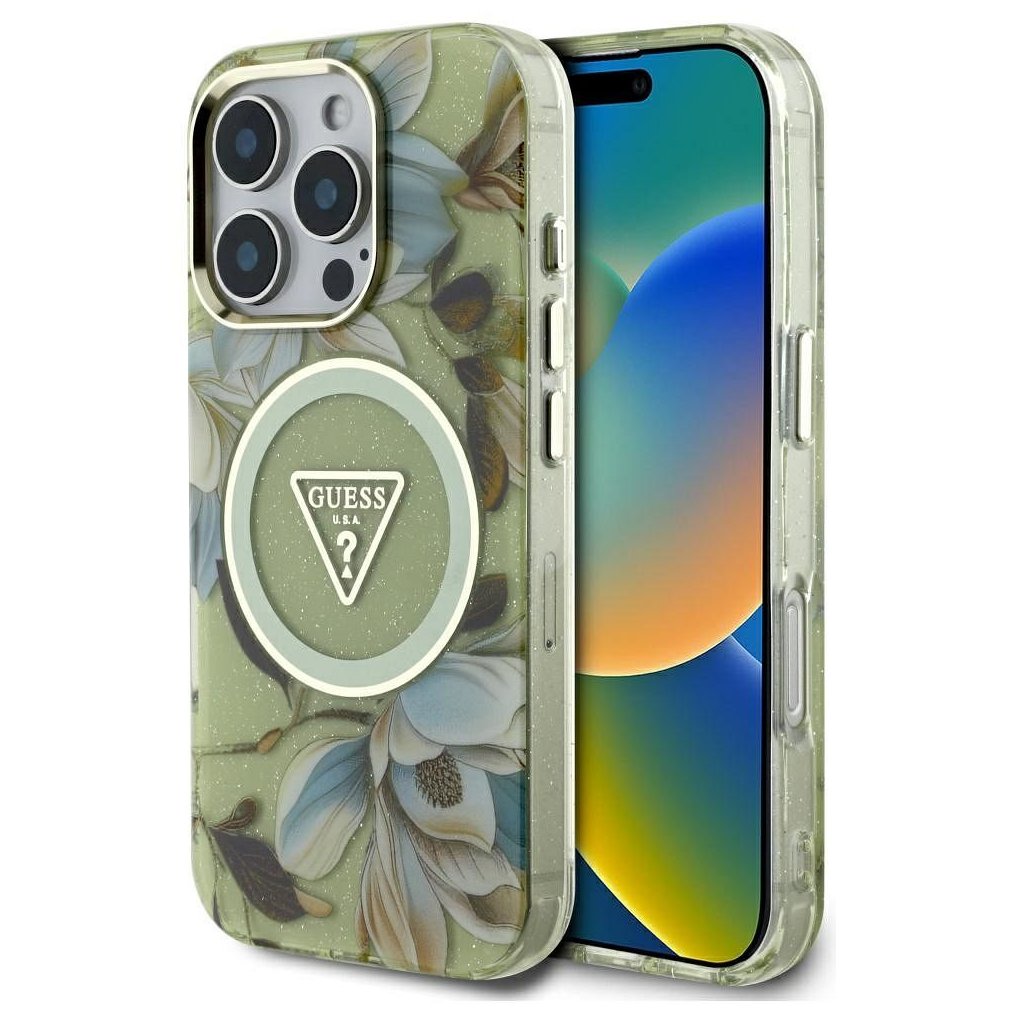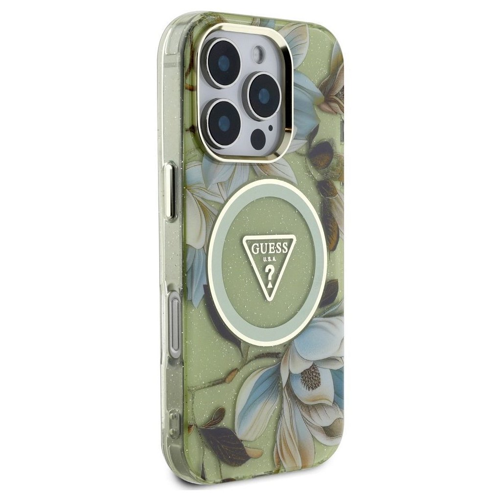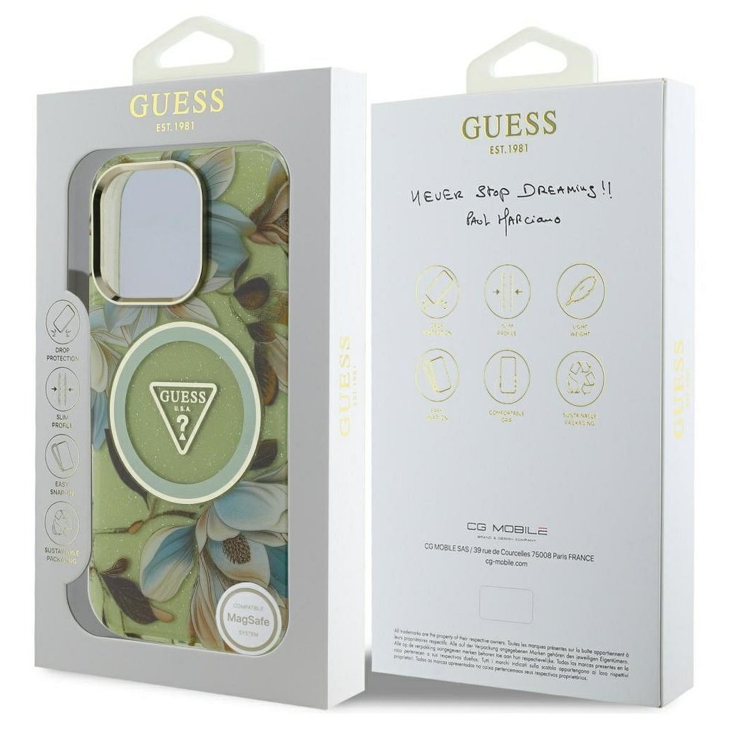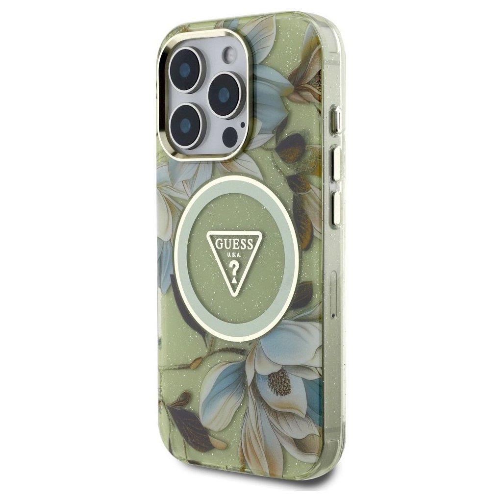 Štýlové a GUESS pre IPHONE 16 Pro Max s MagSafe GUHMP16XHFLPEDN (IML Metal Glitter Flowers Triangle) zelené je kvalitný obal na Váš telefón vyrobený z odolných materiálov, s prepracovanými detailmi a dizajnom.