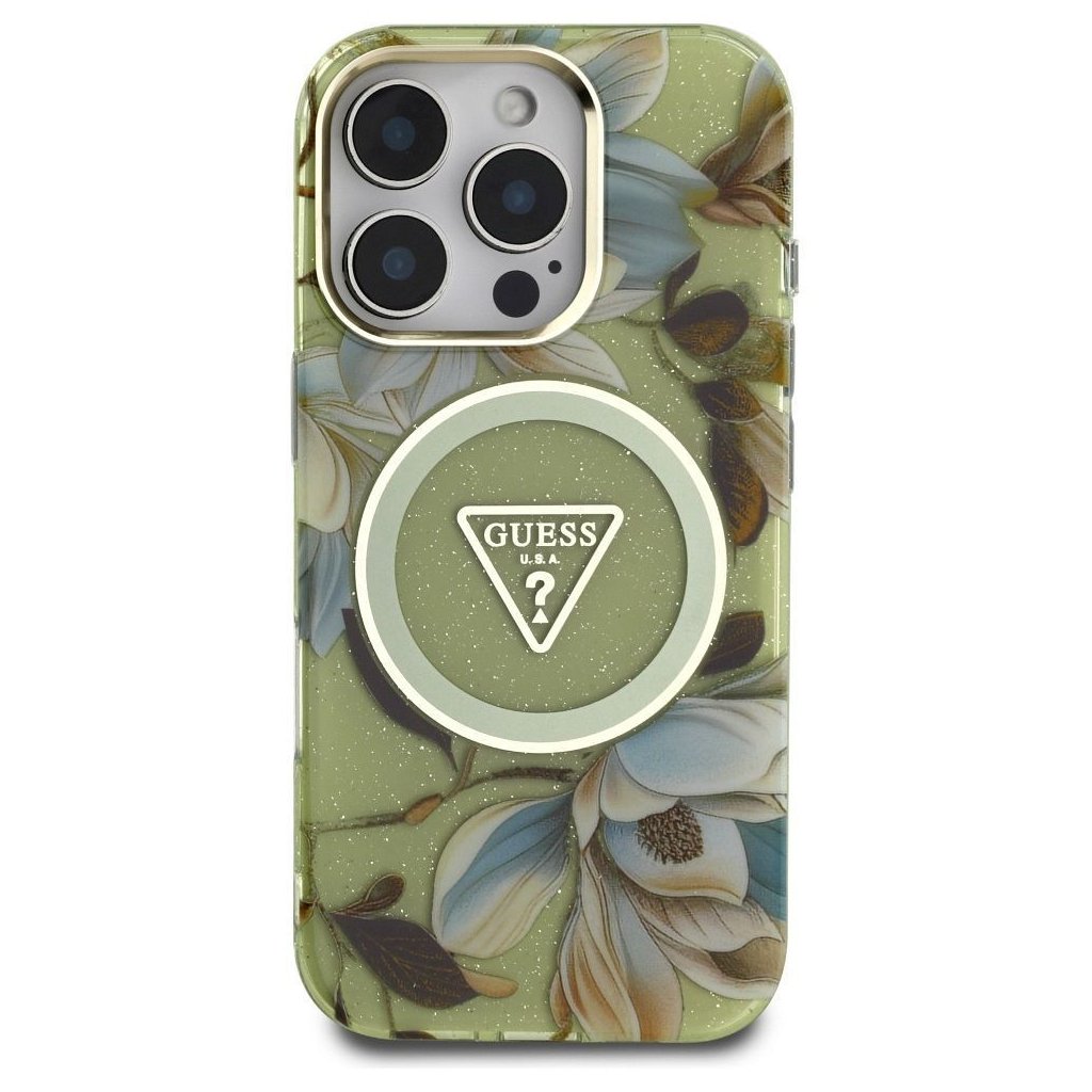 GUESS pre IPHONE 16 Pro Max s MagSafe GUHMP16XHFLPEDN (IML Metal Glitter Flowers Triangle) zelené