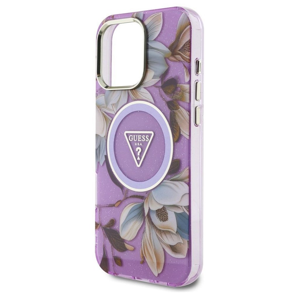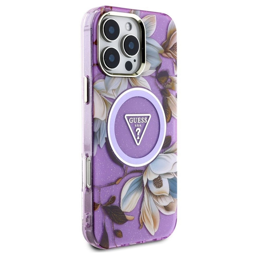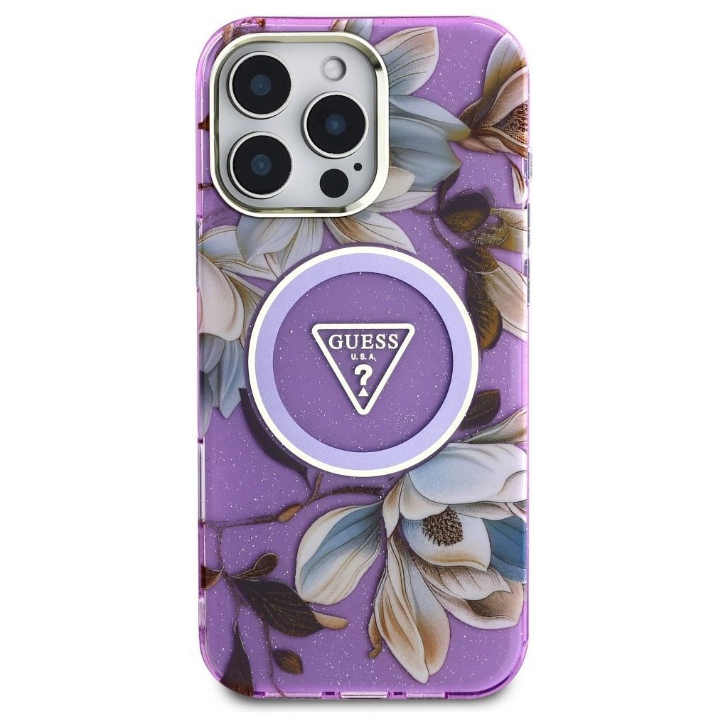 GUESS pre IPHONE 16 Pro Max s MagSafe GUHMP16XHFLPEDU (IML Metal Glitter Flowers Triangle) fialové