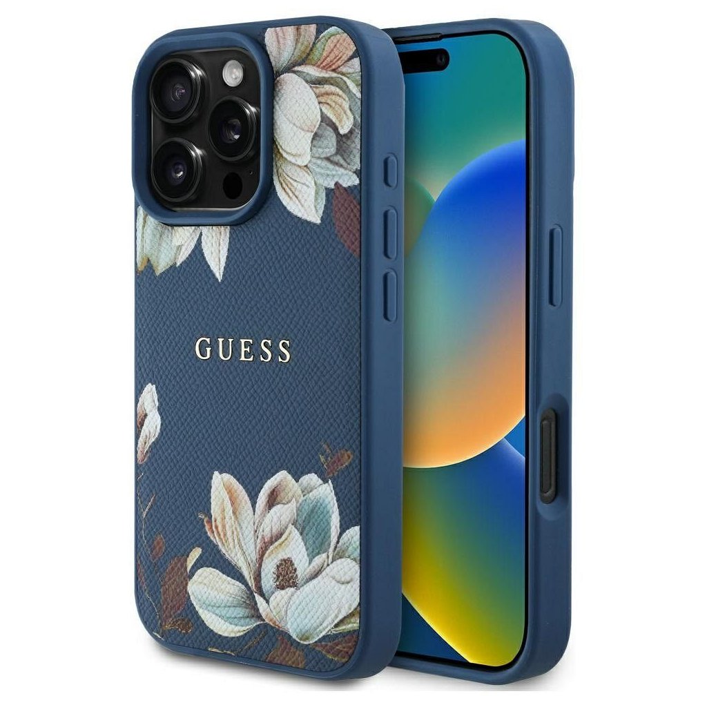 Štýlové a GUESS pre IPHONE 16 Pro Max s MagSafe GUHMP16XPGNMPLMB (PU Grained Flowers Classic Logo) modré je kvalitný obal na Váš telefón vyrobený z odolných materiálov, s prepracovanými detailmi a dizajnom.