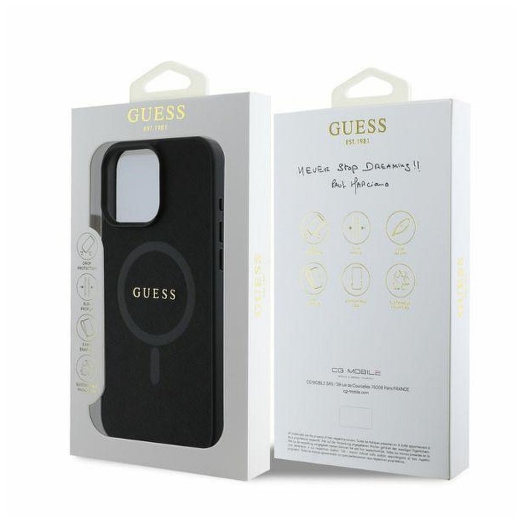 Štýlové a GUESS pre IPHONE 16 Pro Max s MagSafe GUHMP16XPSAHMCK (PU Saffiano Classic Logo) čierne je kvalitný obal na Váš telefón vyrobený z odolných materiálov, s prepracovanými detailmi a dizajnom.