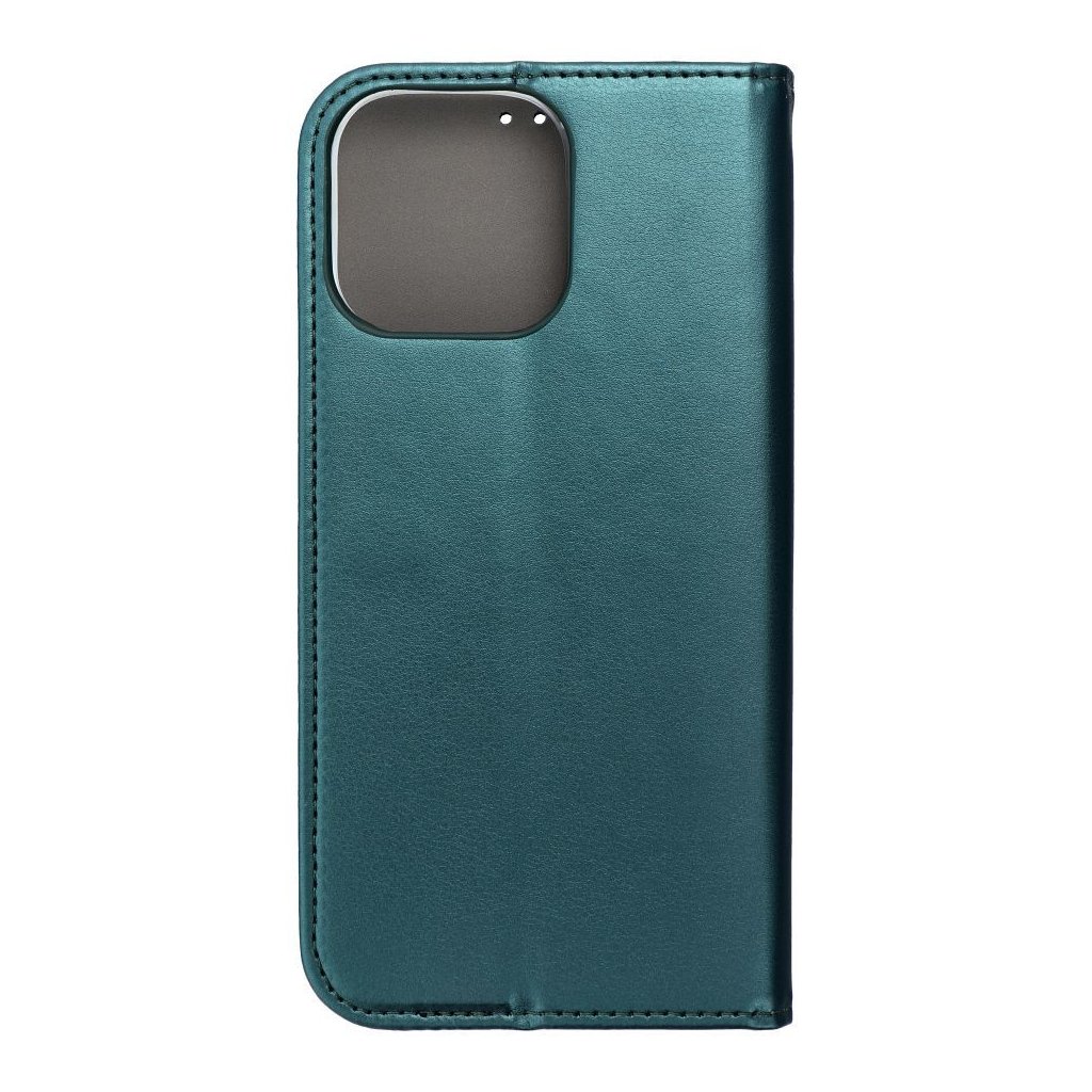 Peňaženkový obal SMART MAGNETO Book pre IPHONE 16 Pro Max tmavo zelený s magnetickým zapínaním je klasické puzdro na telefón s funkciou peňaženky a stojana na TV. Je vyrobené z metalizovaného materiálu, podšité mäkkou tkaninou, ktorá chráni obrazovku pred poškriabaním.