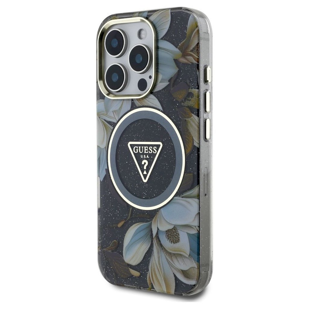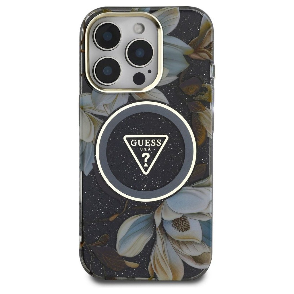 GUESS pre IPHONE 16 Pro s MagSafe GUHMP16LHFLPEDK (IML Metal Glitter Flowers Triangle) čierne