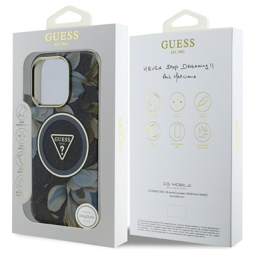 Štýlové a GUESS pre IPHONE 16 Pro s MagSafe GUHMP16LHFLPEDK (IML Metal Glitter Flowers Triangle) čierne je kvalitný obal na Váš telefón vyrobený z odolných materiálov, s prepracovanými detailmi a dizajnom.