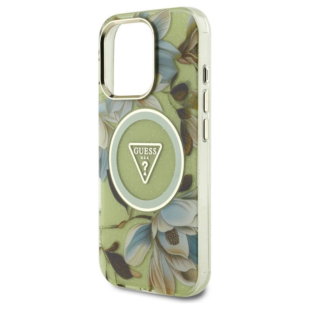 GUESS pre IPHONE 16 Pro s MagSafe GUHMP16LHFLPEDN (IML Metal Glitter Flowers Triangle) zelené