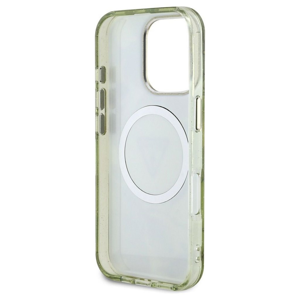 Štýlové a GUESS pre IPHONE 16 Pro s MagSafe GUHMP16LHFLPEDN (IML Metal Glitter Flowers Triangle) zelené je kvalitný obal na Váš telefón vyrobený z odolných materiálov, s prepracovanými detailmi a dizajnom.