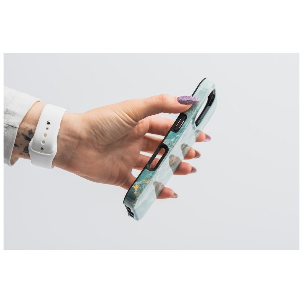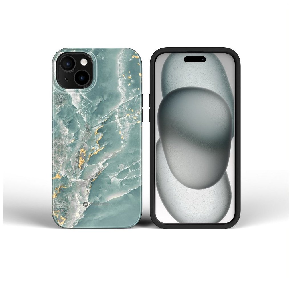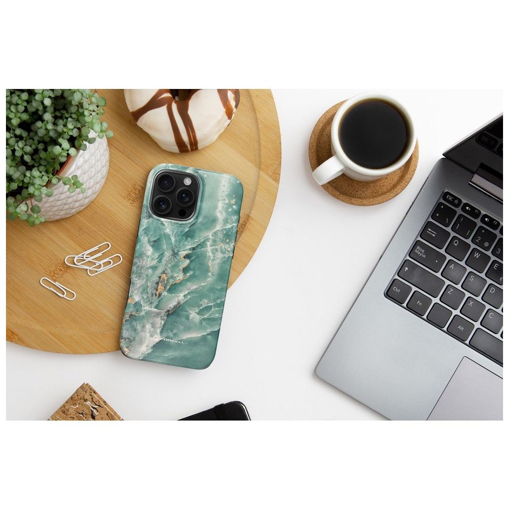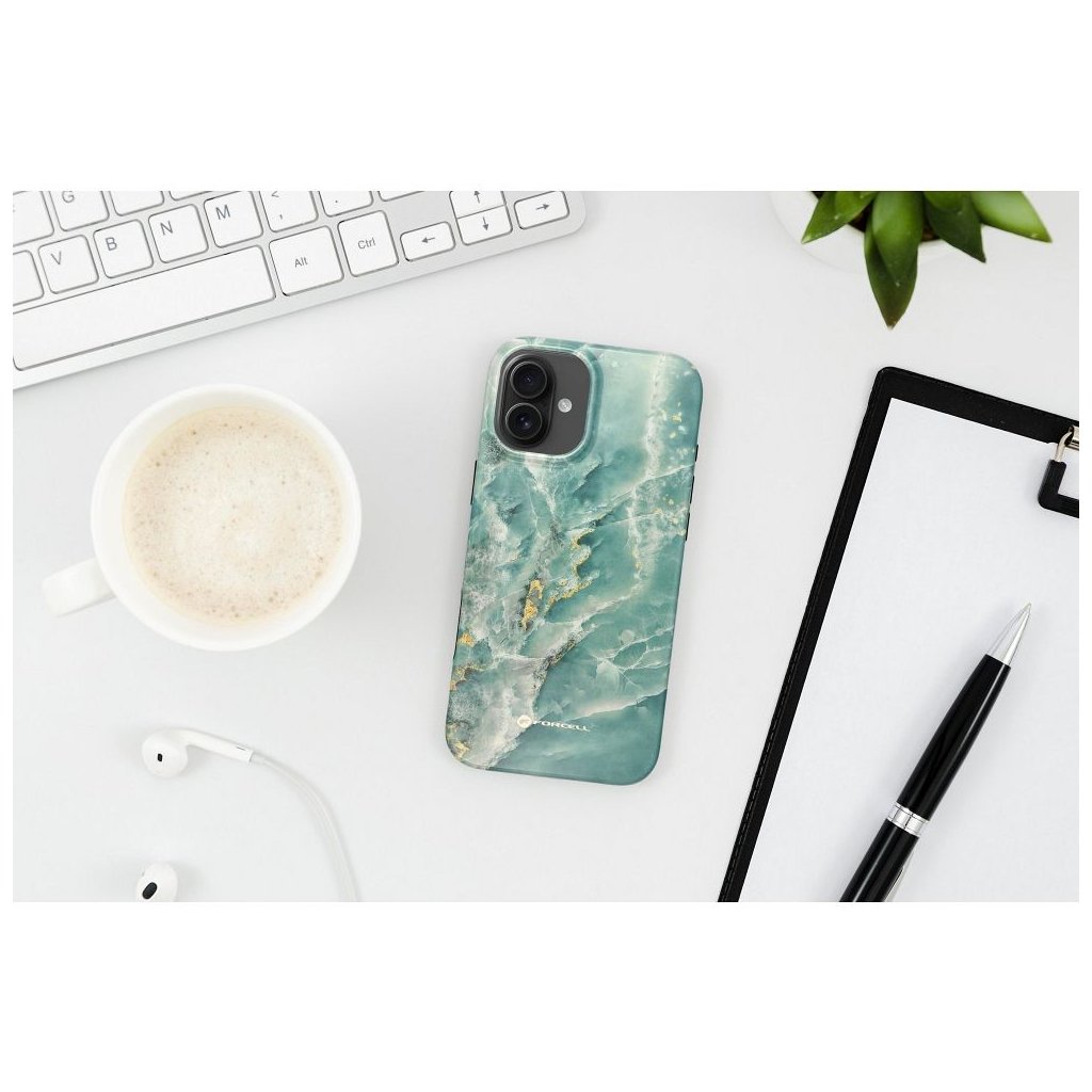 Kvalitný pestrofarebný kryt F-PROTECT Mirage, Military Drop-Tested s MagSafe pre IPHONE 16 PRO zelený mramor sa vyznačuje atraktívnym dizajnom a robustným spracovaním. Jeho výrazná potlač bola vytvorená pomocou technológie 4D a je pokrytá dodatočnou priehľadnou vrstvou, ktorá mu dodáva odolnosť a chráni ho pred odieraním. Puzdro je vyrobené z pružného silikónu a zvýšené okraje na hranách a okolo rámu fotoaparátu chránia smartfón.