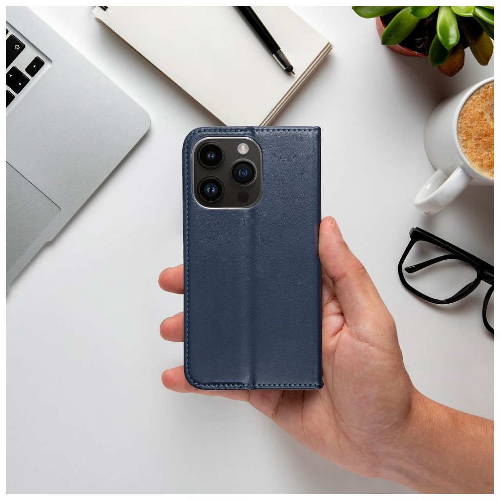 Peňaženkový obal SMART MAGNETO Book pre IPHONE 16 Pro tmavo modrý s magnetickým zapínaním je klasické puzdro na telefón s funkciou peňaženky a stojana na TV. Je vyrobené z metalizovaného materiálu, podšité mäkkou tkaninou, ktorá chráni obrazovku pred poškriabaním.