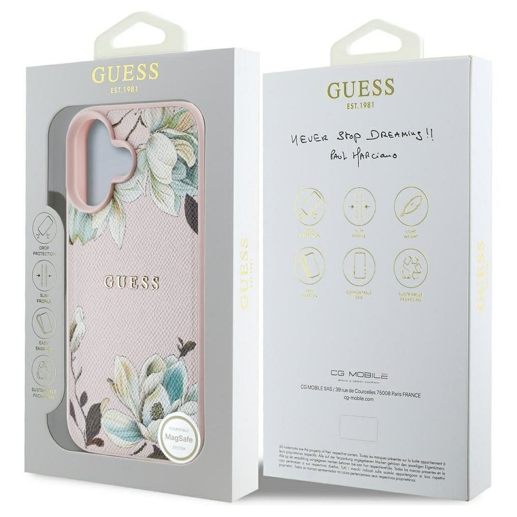 Štýlové a GUESS pre IPHONE 16 s MagSafe GUHMP16SPGNMPLMP (PU Grained Flowers Classic Logo) ružové je kvalitný obal na Váš telefón vyrobený z odolných materiálov, s prepracovanými detailmi a dizajnom.