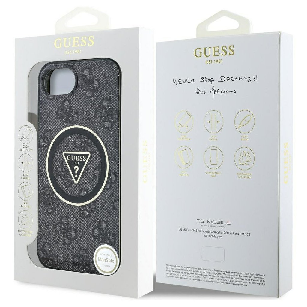Štýlové a GUESS pre IPHONE 16e (SE 4 2025) s MagSafe GUHMPSE4HG4PRTGK (IML Metal Glitter 4G Circle Triangle) čierne je kvalitný obal na Váš telefón vyrobený z odolných materiálov, s prepracovanými detailmi a dizajnom.