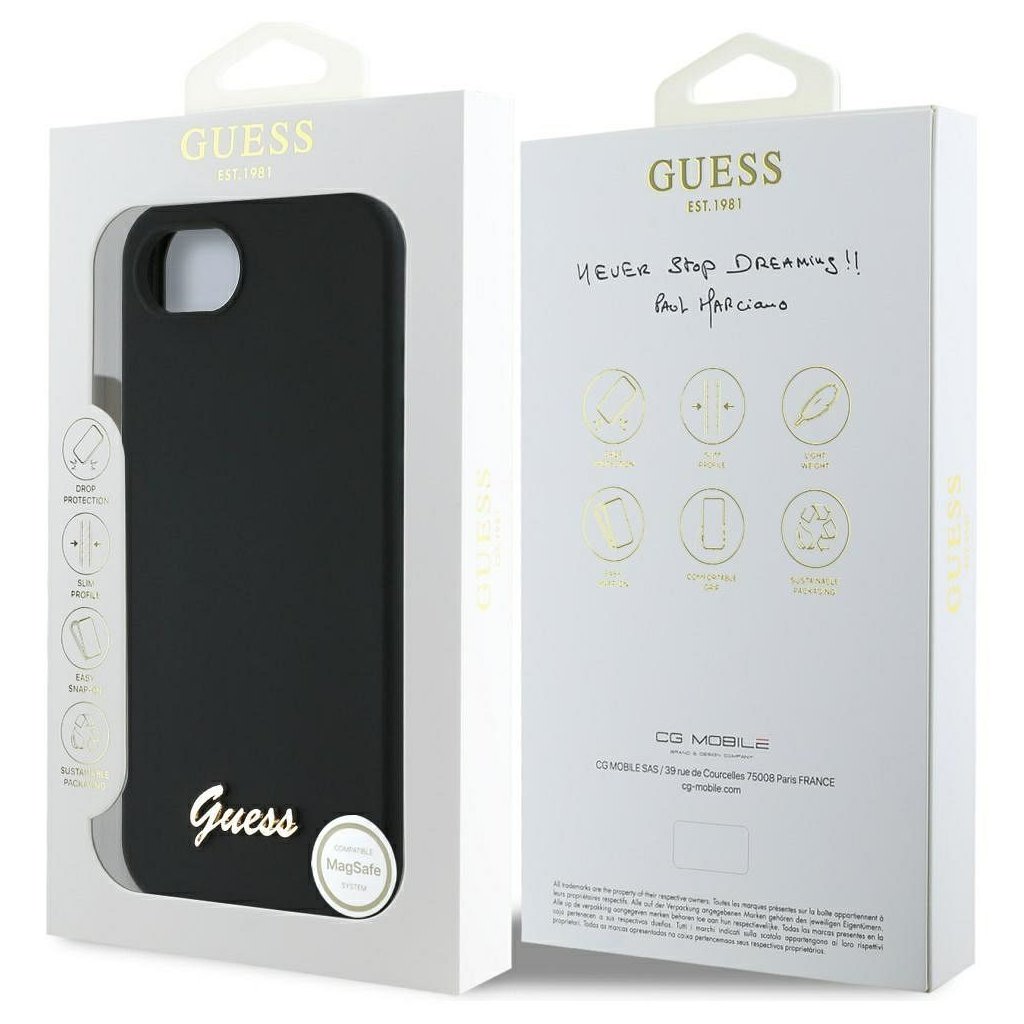 Štýlové a GUESS pre IPHONE 16e (SE 4 2025) s MagSafe GUHMPSE4SMBSLK (Silicone Script Metal Logo) čierne je kvalitný obal na Váš telefón vyrobený z odolných materiálov, s prepracovanými detailmi a dizajnom.
