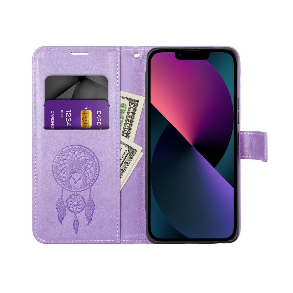 Peňaženkové / zatváracie Puzdro MEZZO Book pre IPHONE 16e (SE 4 2025) lapač snov - fialové zaujme predovšetkým spracovaním vzoru mandaly, stromu, prípadne lapača snov. Oproti iným puzdrom podobného typu nie sú totiž vzory u puzdier Forcell Mezzo Book natlačené, ale vtlačené priamo do materiálu (ekologická koža). Vďaka tomu sa vzor jednak nezotrie, ale môžete ho naozaj na dotyk cítiť.