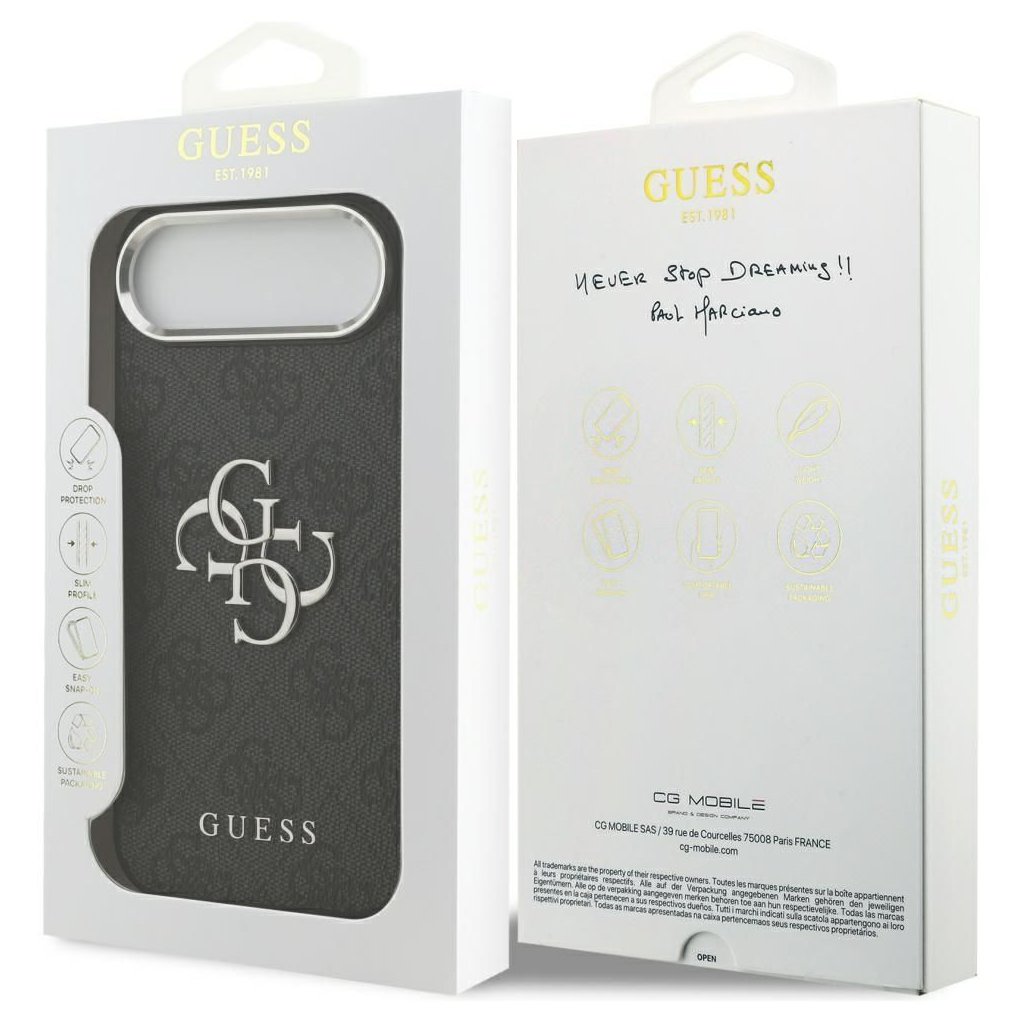 Štýlové a GUESS pre IPHONE 17 Air GUHCP17MP4G4SMCK (4G PU Leather with Big 4G and Classic Logo and strieborné Metal Camera Frame) čierne je kvalitný obal na Váš telefón vyrobený z odolných materiálov, s prepracovanými detailmi a dizajnom.
