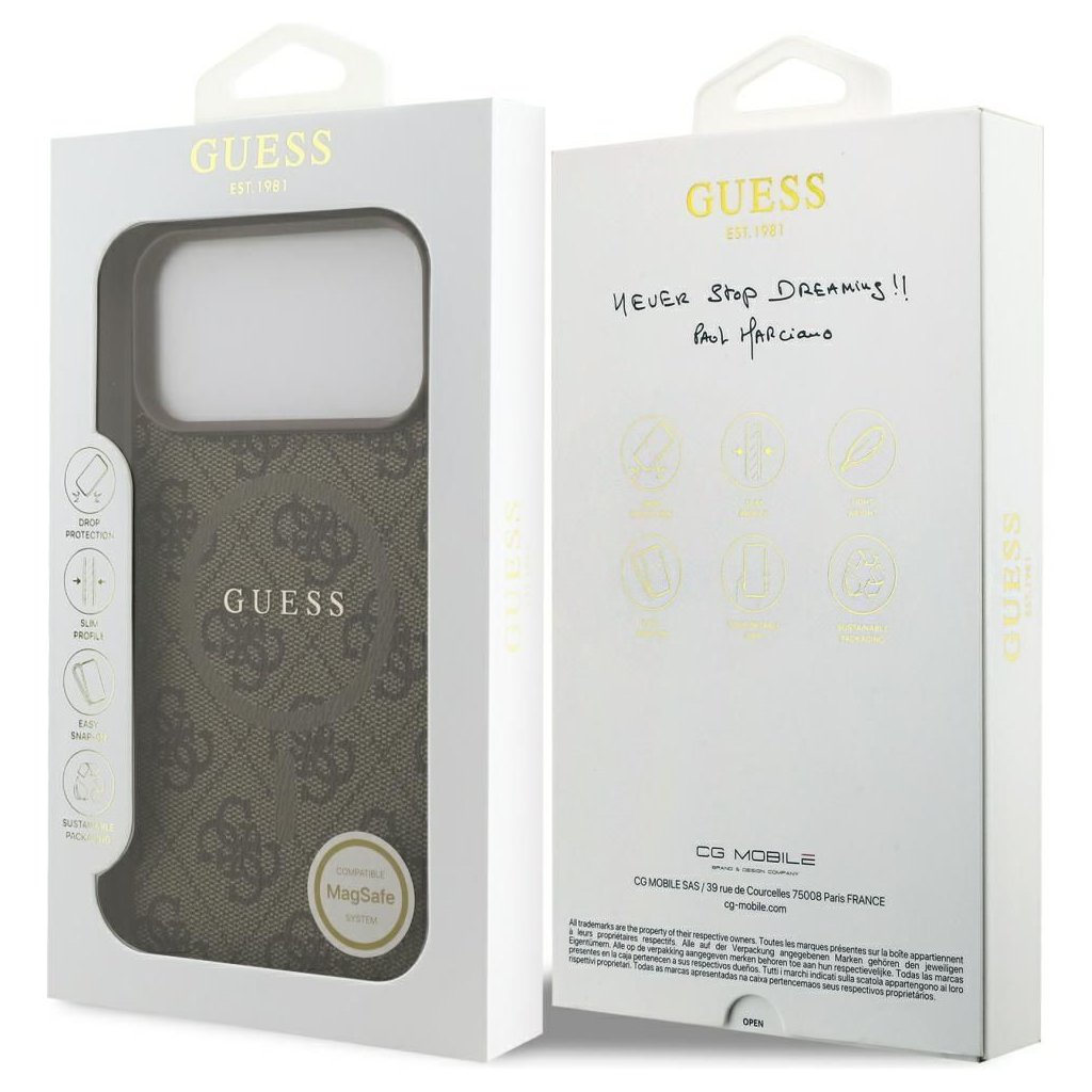 Štýlové a GUESS pre IPHONE 17 Pro Max s MagSafe GUHMP17XG4GFRW (PU 4G Ring Classic Logo) hnedé je kvalitný obal na Váš telefón vyrobený z odolných materiálov, s prepracovanými detailmi a dizajnom.