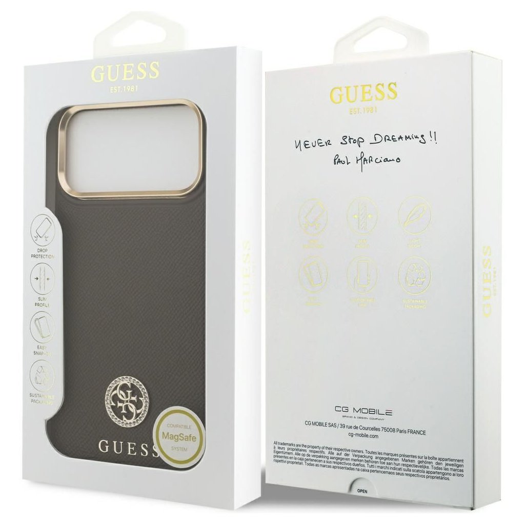 Štýlové a GUESS pre IPHONE 17 Pro Max s MagSafe GUHMP17XPGCRMDEW (PU W/ Grained Strass Logo) hnedé je kvalitný obal na Váš telefón vyrobený z odolných materiálov, s prepracovanými detailmi a dizajnom.