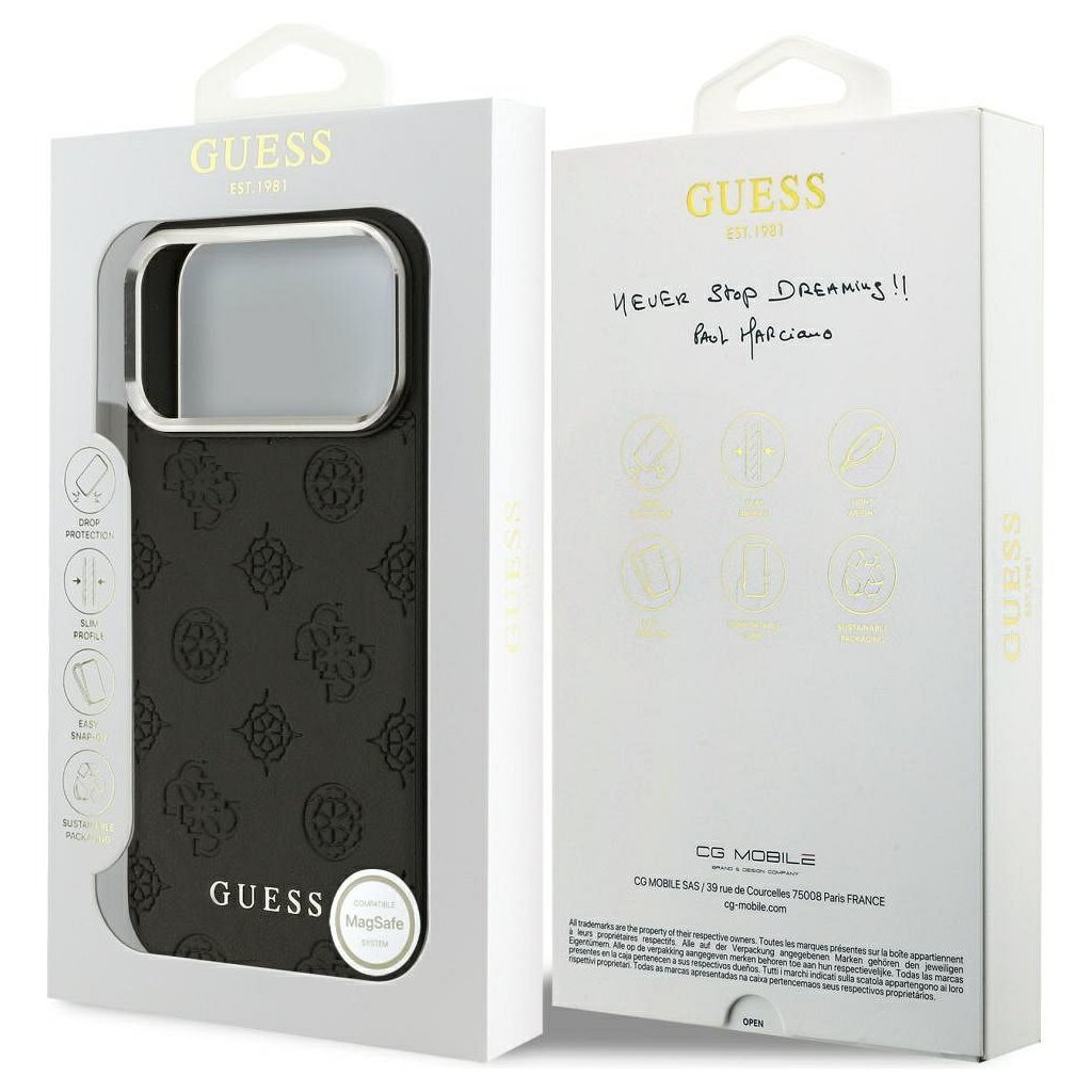 Štýlové a GUESS pre IPHONE 17 Pro Max s MagSafe GUHMP17XPSPOSSSK (PU W/ Peony Hot Stamp Script) čierne je kvalitný obal na Váš telefón vyrobený z odolných materiálov, s prepracovanými detailmi a dizajnom.