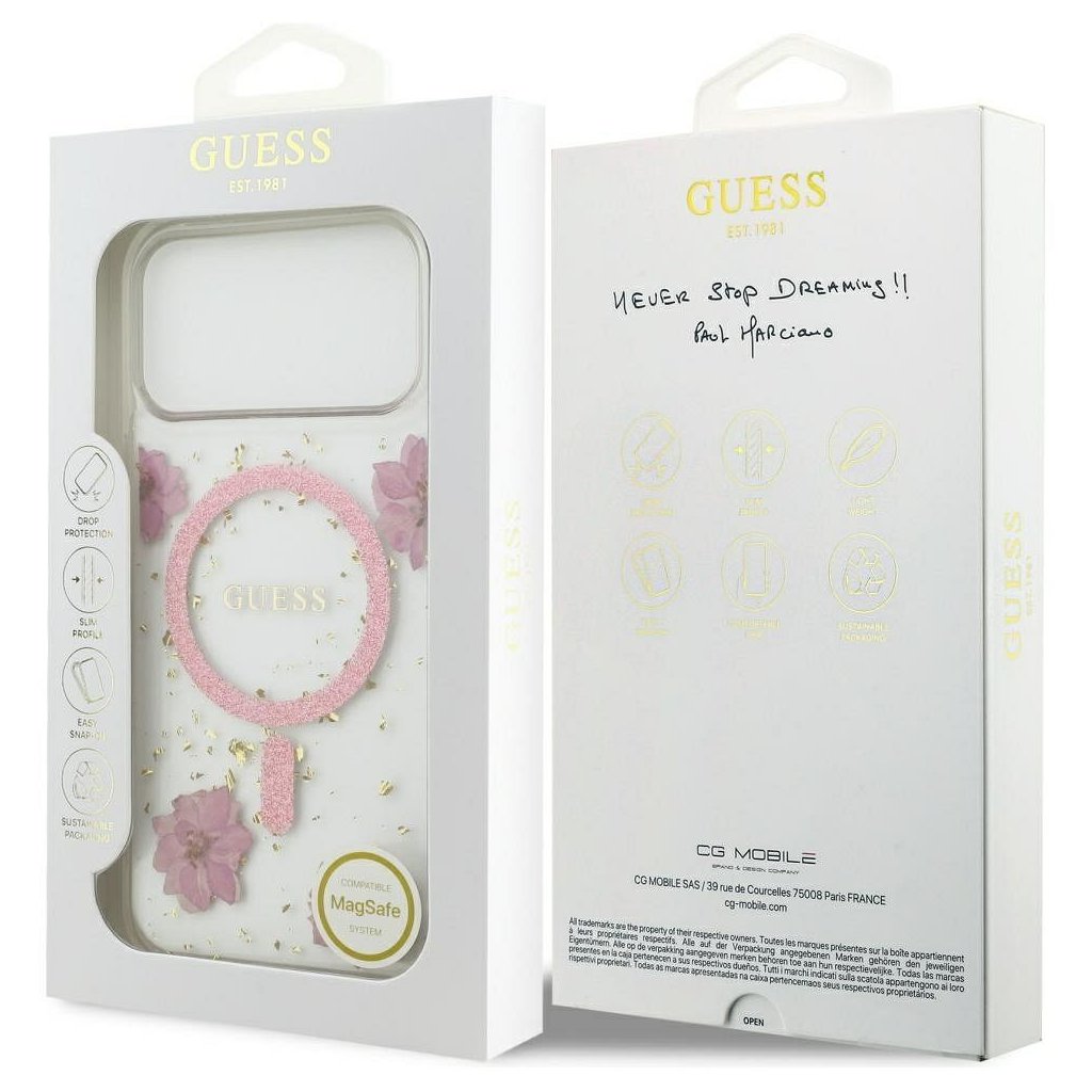 Štýlové a GUESS pre IPHONE 17 Pro Max s MagSafe GUHMP17XRBFGFGMP (Resin Flowers and Glitter) ružové je kvalitný obal na Váš telefón vyrobený z odolných materiálov, s prepracovanými detailmi a dizajnom.