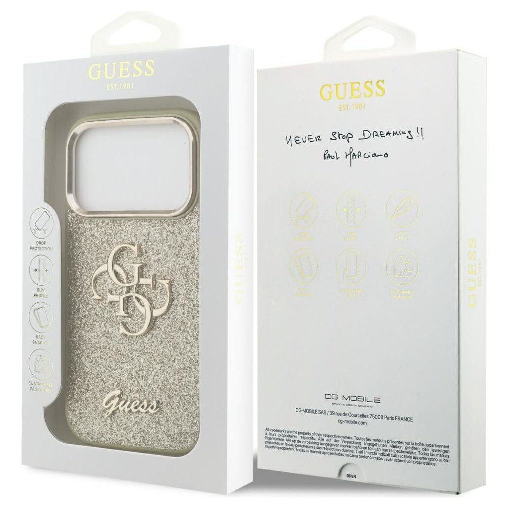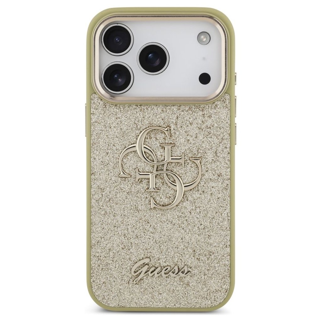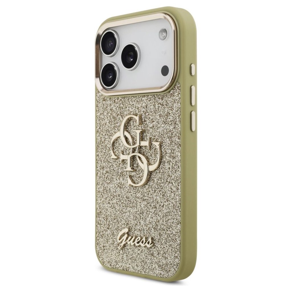 Štýlové a GUESS pre IPHONE 17 Pro GUHCP17LHG4SGCD (Fixed Glitter Big 4G Metal Frame) zlaté je kvalitný obal na Váš telefón vyrobený z odolných materiálov, s prepracovanými detailmi a dizajnom.
