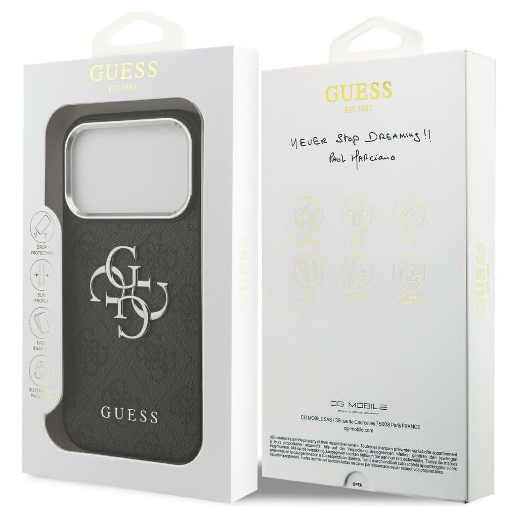 Štýlové a GUESS pre IPHONE 17 Pro GUHCP17LP4G4SMCK (4G PU Leather with Big 4G and Classic Logo and strieborné Metal Camera Frame) čierne je kvalitný obal na Váš telefón vyrobený z odolných materiálov, s prepracovanými detailmi a dizajnom.