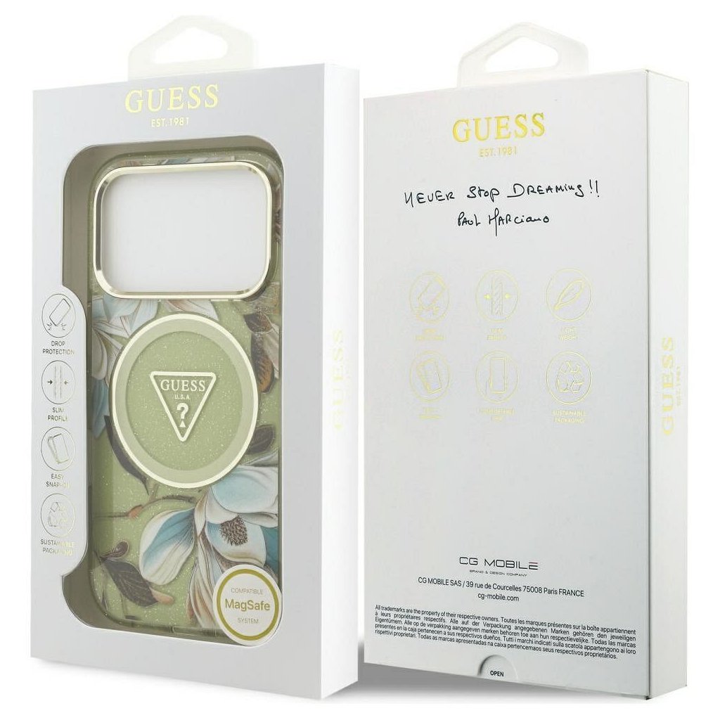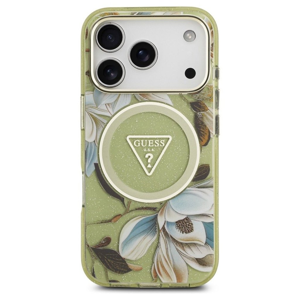 Štýlové a GUESS pre IPHONE 17 Pro s MagSafe GUHMP17LHFLPEDN (IML Metal Glitter Flowers Triangle) zelené je kvalitný obal na Váš telefón vyrobený z odolných materiálov, s prepracovanými detailmi a dizajnom.