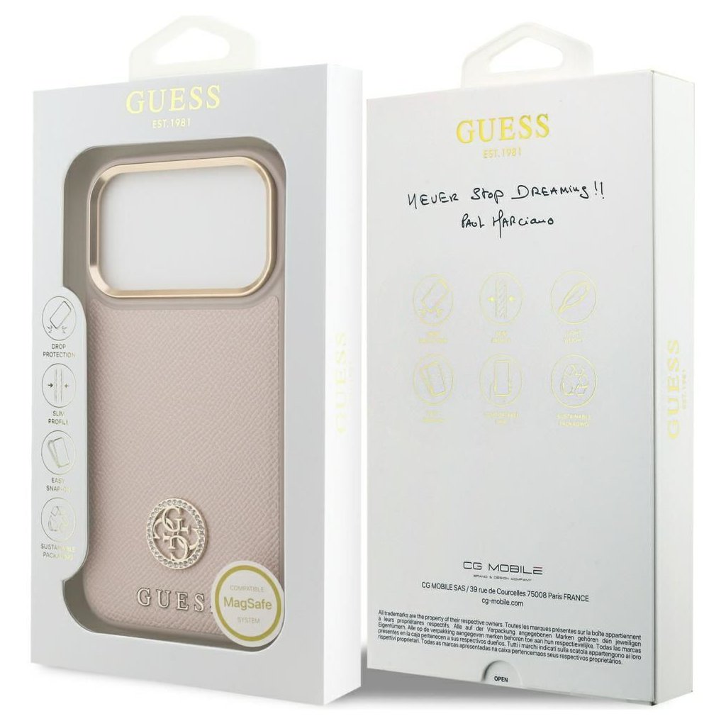 Štýlové a GUESS pre IPHONE 17 Pro s MagSafe GUHMP17LPGCRMDEP (PU W/ Grained Strass Logo) ružové je kvalitný obal na Váš telefón vyrobený z odolných materiálov, s prepracovanými detailmi a dizajnom.