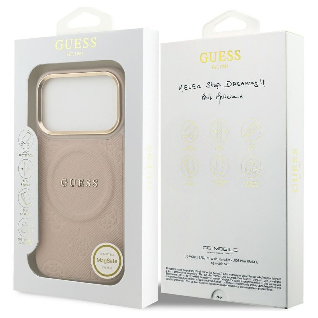 Štýlové a GUESS pre IPHONE 17 Pro s MagSafe GUHMP17LPSAMSECP (PU W/ Peony Hot Stamp) ružové je kvalitný obal na Váš telefón vyrobený z odolných materiálov, s prepracovanými detailmi a dizajnom.
