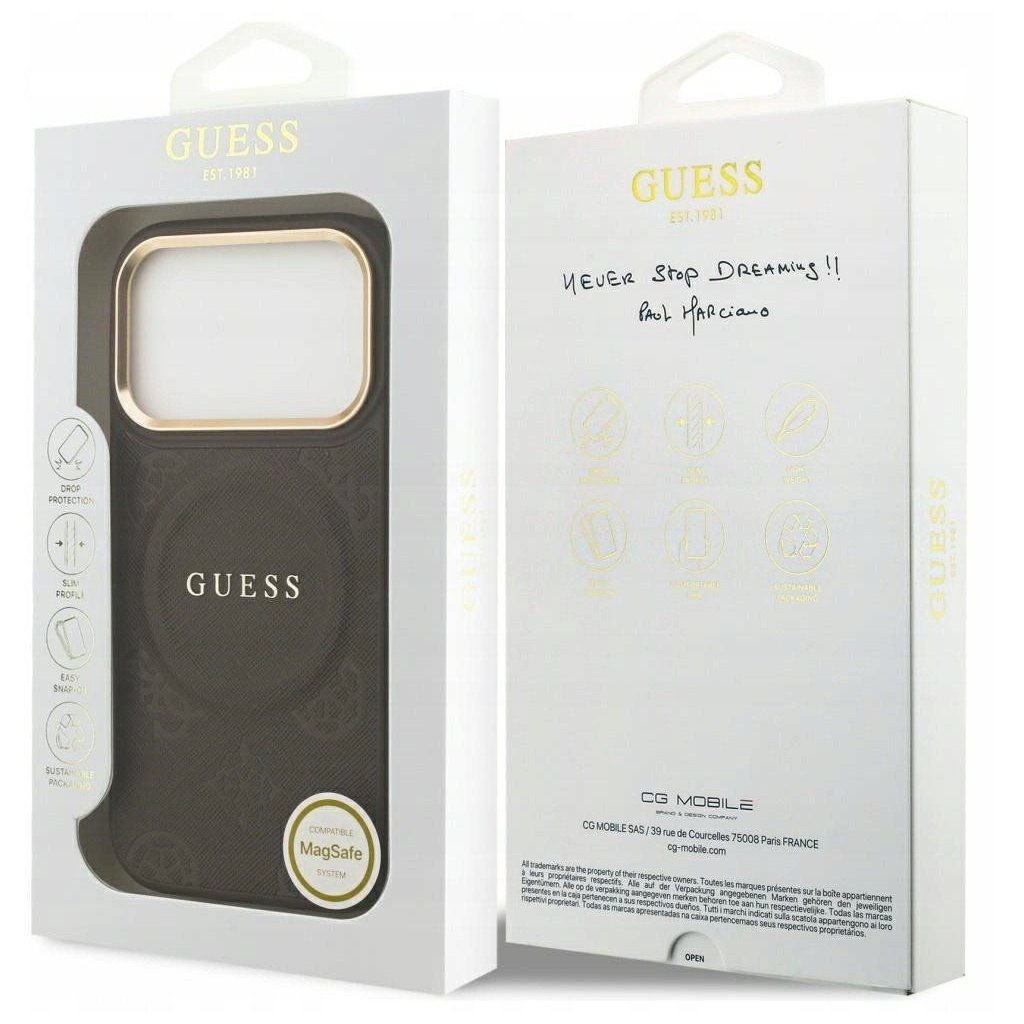 Štýlové a GUESS pre IPHONE 17 Pro s MagSafe GUHMP17LPSAMSECW (PU W/ Peony Hot Stamp) hnedé je kvalitný obal na Váš telefón vyrobený z odolných materiálov, s prepracovanými detailmi a dizajnom.