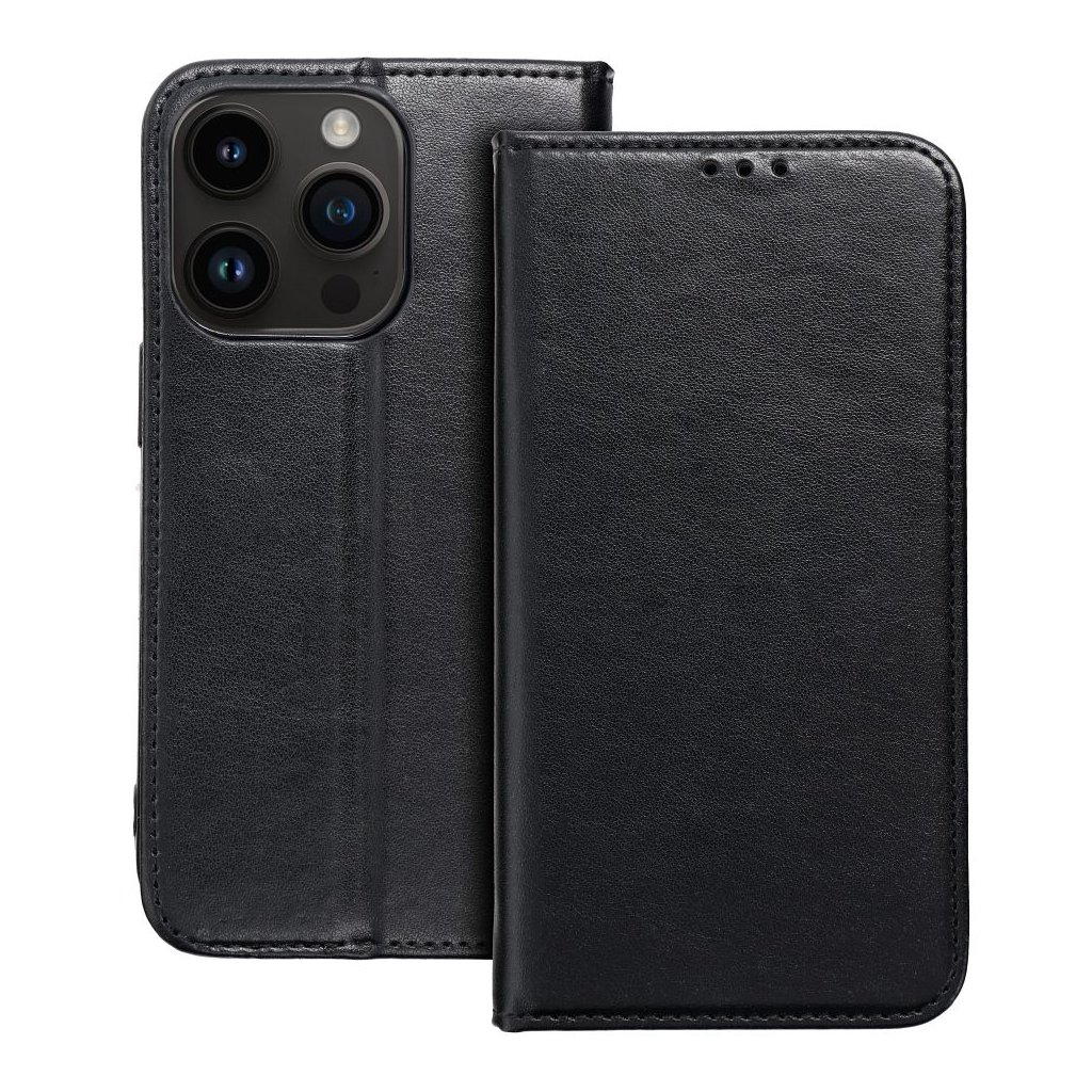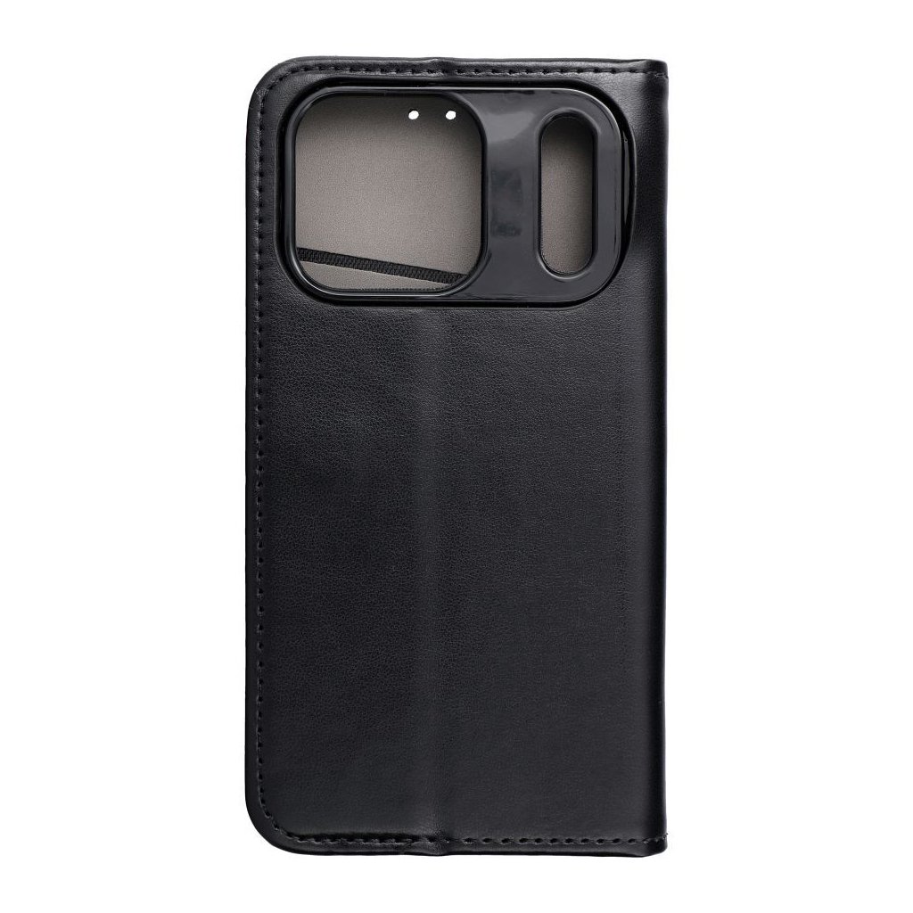 Peňaženkový obal SMART MAGNETO Book pre IPHONE 17 Pro čierny s magnetickým zapínaním je klasické puzdro na telefón s funkciou peňaženky a stojana na TV. Je vyrobené z metalizovaného materiálu, podšité mäkkou tkaninou, ktorá chráni obrazovku pred poškriabaním.
