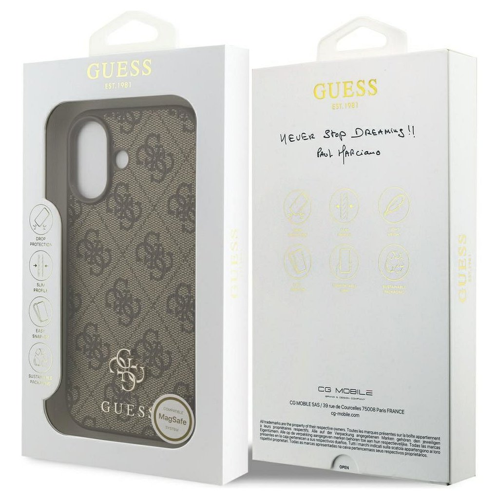 Štýlové a GUESS pre IPHONE 17 s MagSafe GUHMP17SP4SM4MW (PU 4G Small 4G and Classic) hnedé je kvalitný obal na Váš telefón vyrobený z odolných materiálov, s prepracovanými detailmi a dizajnom.