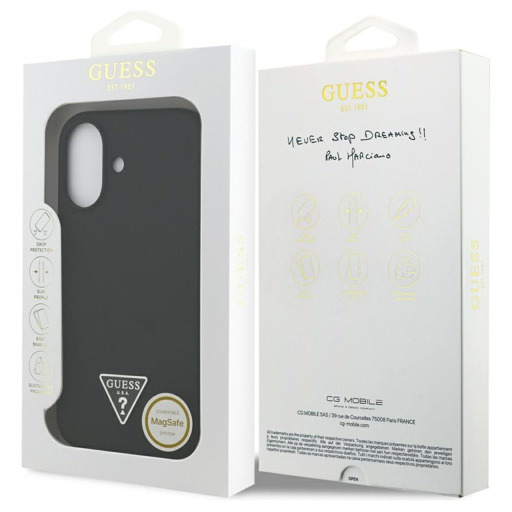 Štýlové a GUESS pre IPHONE 17 s MagSafe GUHMP17SSCTRLMK (Silicone W/ Triangle Logo) čierne je kvalitný obal na Váš telefón vyrobený z odolných materiálov, s prepracovanými detailmi a dizajnom.