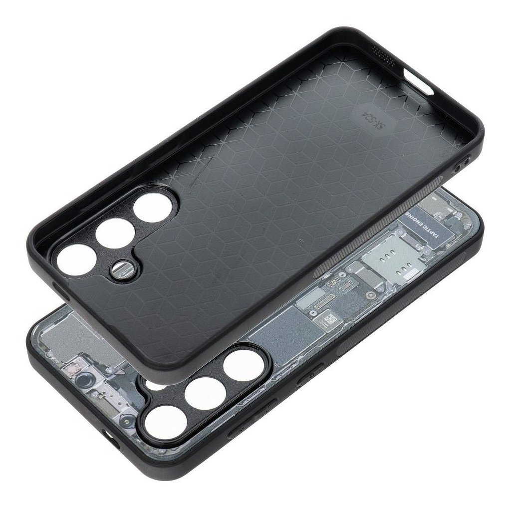 Zadná strana sa vyznačuje vzorom, ktorý imituje vnútro telefónu. Neobvyklý dizajn puzdra dopĺňa elegantná povrchová úprava hrán a vnútra - matná čierna.