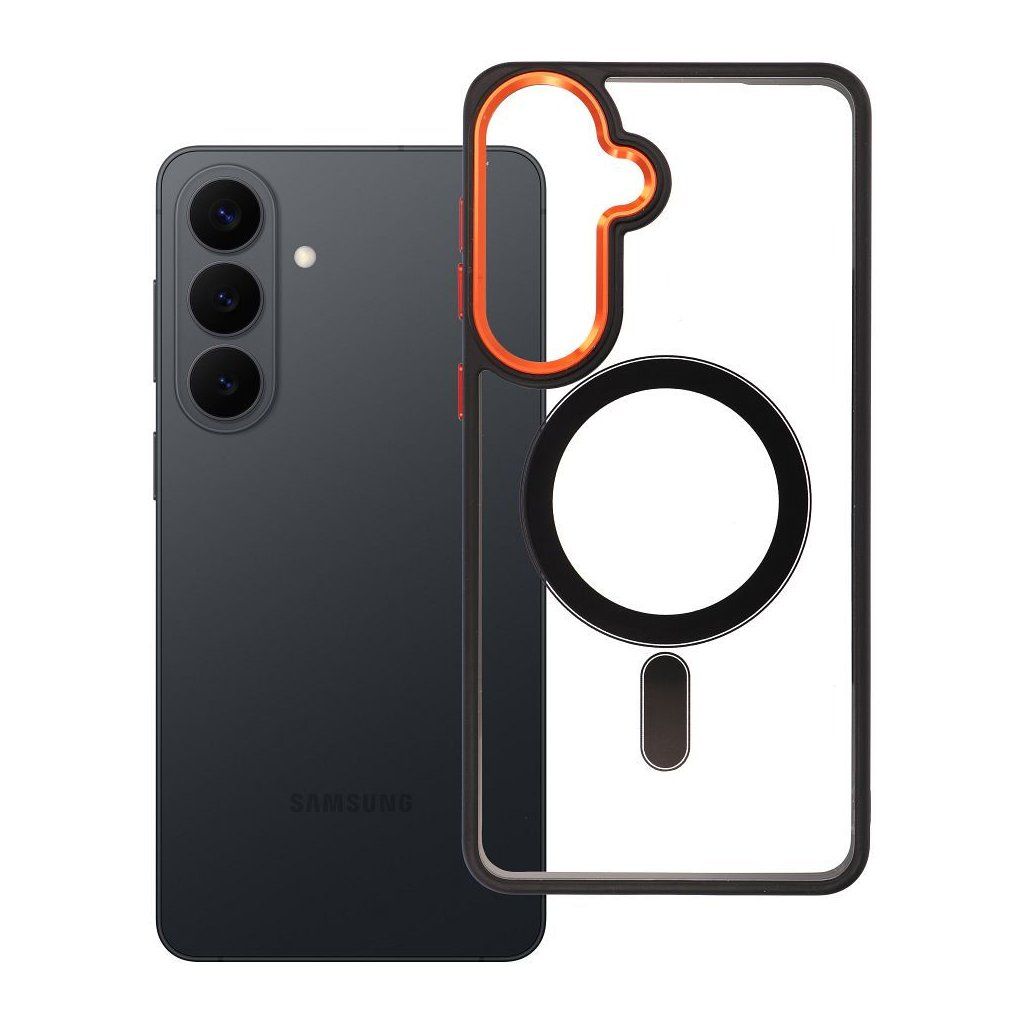 MagSafe priehľadný kryt Case for Samsung S26 PLUS Color Edge Mag Cover compatible with MagSafe czarno čierny-gold ponúka vynikajúcu ochranu vášho smartfónu a jeho odolná a priehľadná povrchová úprava chráni pred nárazmi alebo poškriabaním. Produkt je kompatibilný s technológiou MagSafe, ktorá umožňuje indukčné nabíjanie.