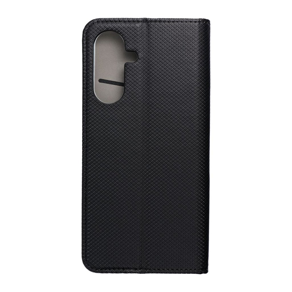 Peňaženkový alebo takzvaný knižkový Obal SMART CASE Book pre SAMSUNG A56 5G čierny je vyrobený z mäkkej technickej kože, ktorá je opatrená povrchovou úpravou s metalickou štruktúrou. Vďaka tomu sa puzdro za denného svetla ľahko leskne. Prešívanie na okrajoch zdôrazňuje jeho elegantný vzhľad a puzdro je vďaka nemu aj pevnejšie.