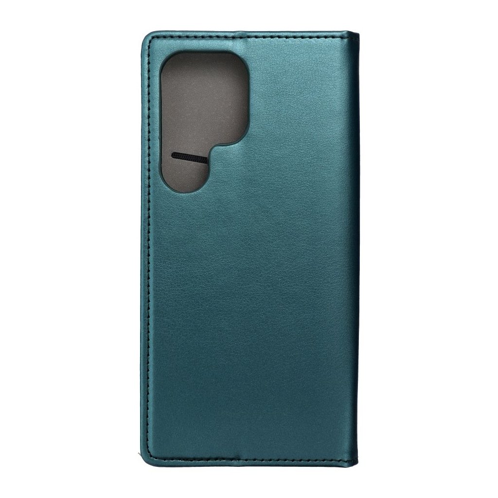 Peňaženkový obal SMART MAGNETO Book pre SAMSUNG S25 Ultra tmavo zelený s magnetickým zapínaním je klasické puzdro na telefón s funkciou peňaženky a stojana na TV. Je vyrobené z metalizovaného materiálu, podšité mäkkou tkaninou, ktorá chráni obrazovku pred poškriabaním.
