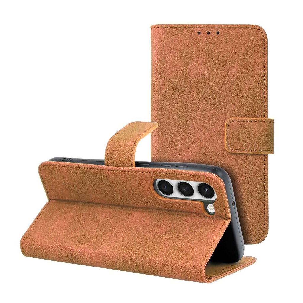 Zatvárací peňaženkový obal TENDER Book pre SAMSUNG S23 hnedý v príjemnej imitácii kože v decentných farbách je ako stvorené pre každého, kto má skutočne štýl. Materiál je na dotyk veľmi príjemný a mäkký, telefónu ale poskytuje plnú ochranu zo všetkých strán.