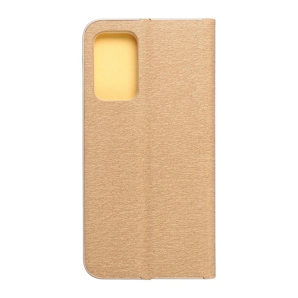 Peňaženkové puzdro LUNA Book pre SAMSUNG A52 5G / A52 LTE ( 4G ) / A52s 5G zlaté je vyrobené z kvalitnej mäkkej technickej kože s atraktívnou textúrou, ktorá je po okrajoch vystužená hliníkovým rámom. Puzdro je preto nielen veľmi elegantné, ale aj pevnejšie a stabilnejšie. Mäkká semišová úprava vnútornej strany puzdra zaručuje skvelú ochranu displeja pred poškriabaním.