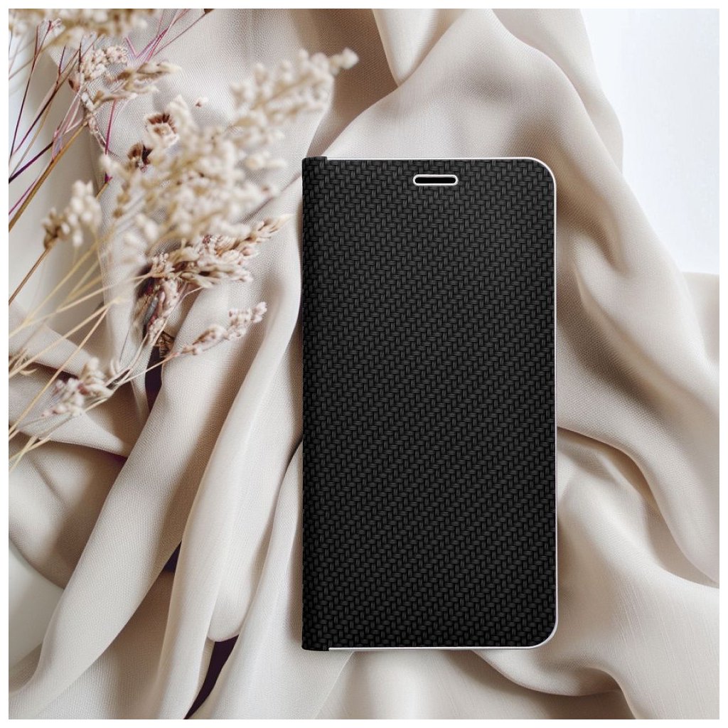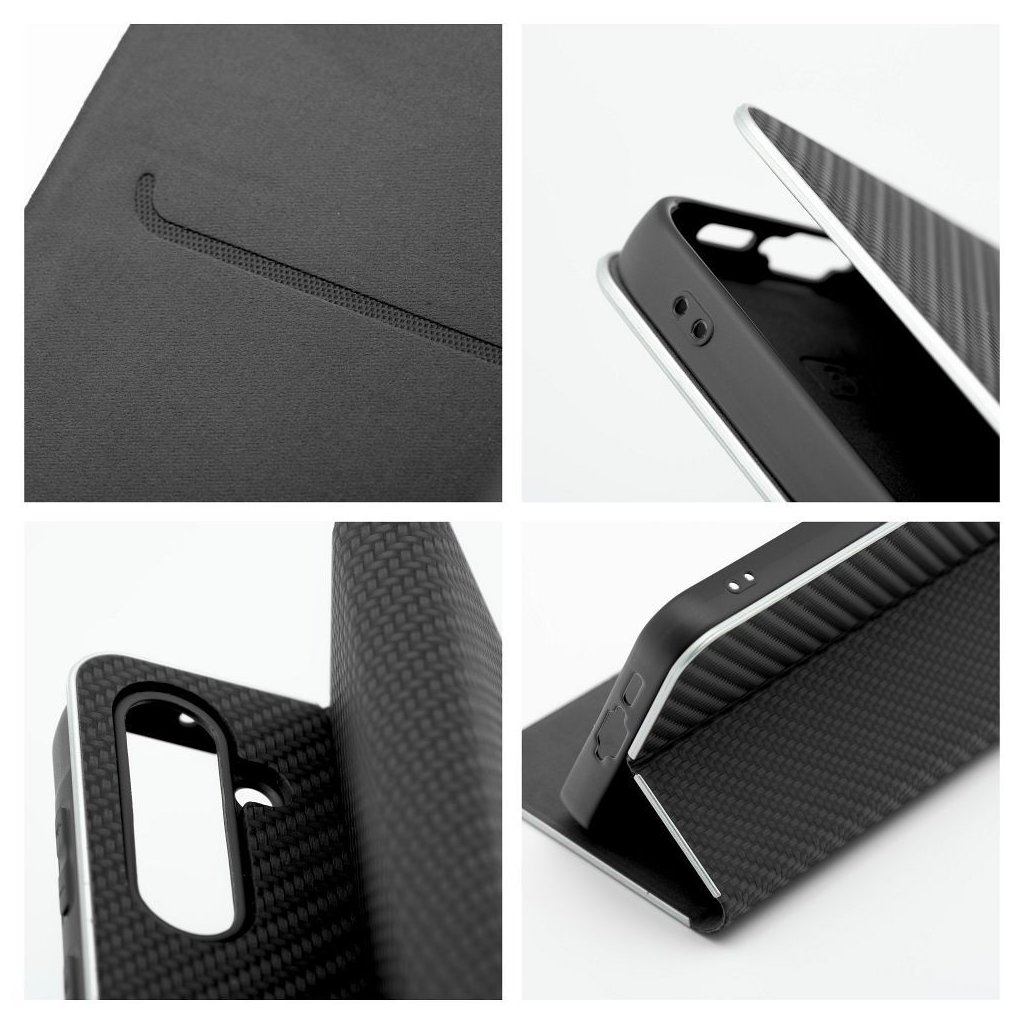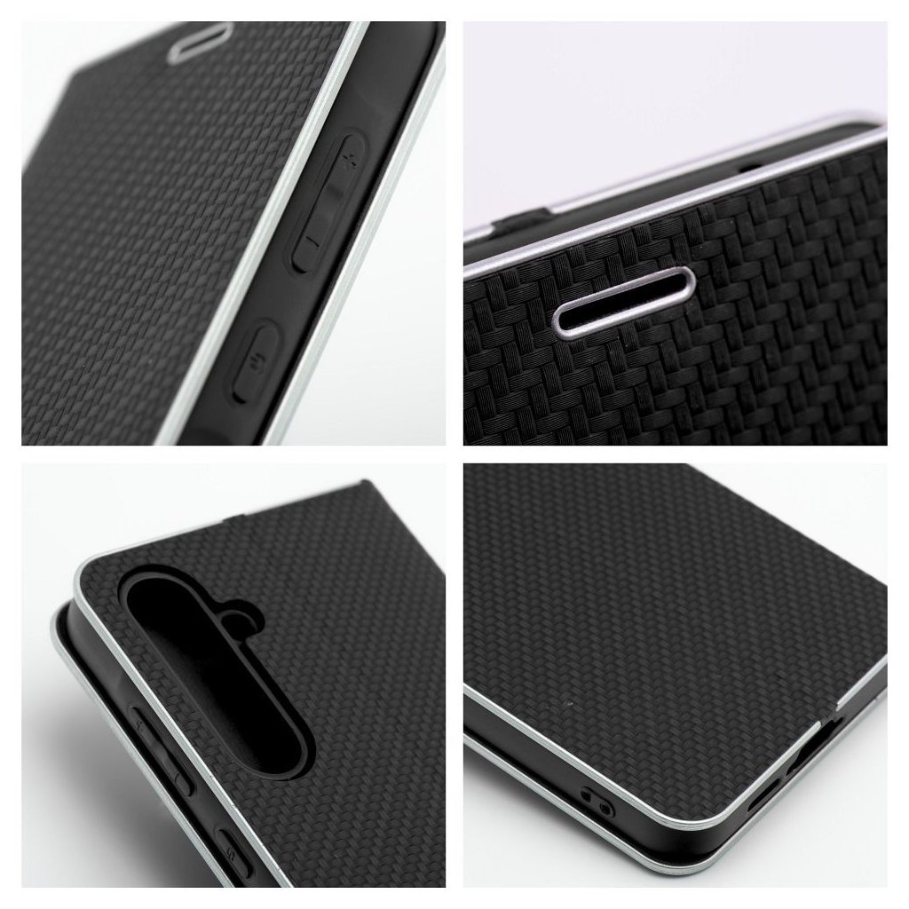 Peňaženkové puzdro LUNA Book Carbon pre SAMSUNG S25 čierne je vyrobené z kvalitnej mäkkej technickej kože s atraktívnou textúrou, ktorá je po okrajoch vystužená hliníkovým rámom. Puzdro je preto nielen veľmi elegantné, ale aj pevnejšie a stabilnejšie. Mäkká semišová úprava vnútornej strany puzdra zaručuje skvelú ochranu displeja pred poškriabaním.