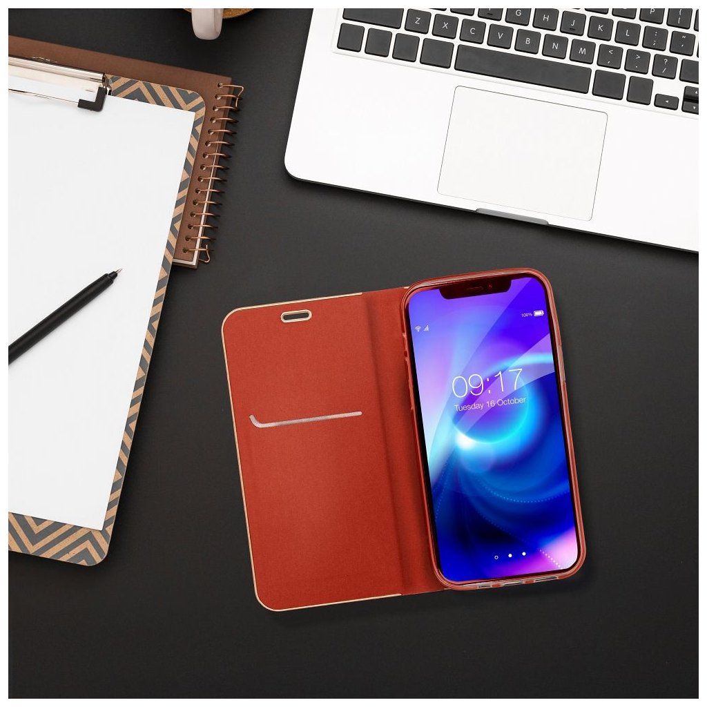 Vo vnútri knižkové puzdra Luna book nájdete flexibilný silikónový držiak, ktorý je prispôsobený pre váš mobil. Udrží váš telefón v stabilnej polohe a chráni jeho hrany. Na vnútornej strane sa nachádza aj vrecko, ktoré môžete využiť ako peňaženku alebo úložný priestor na doklady či karty.