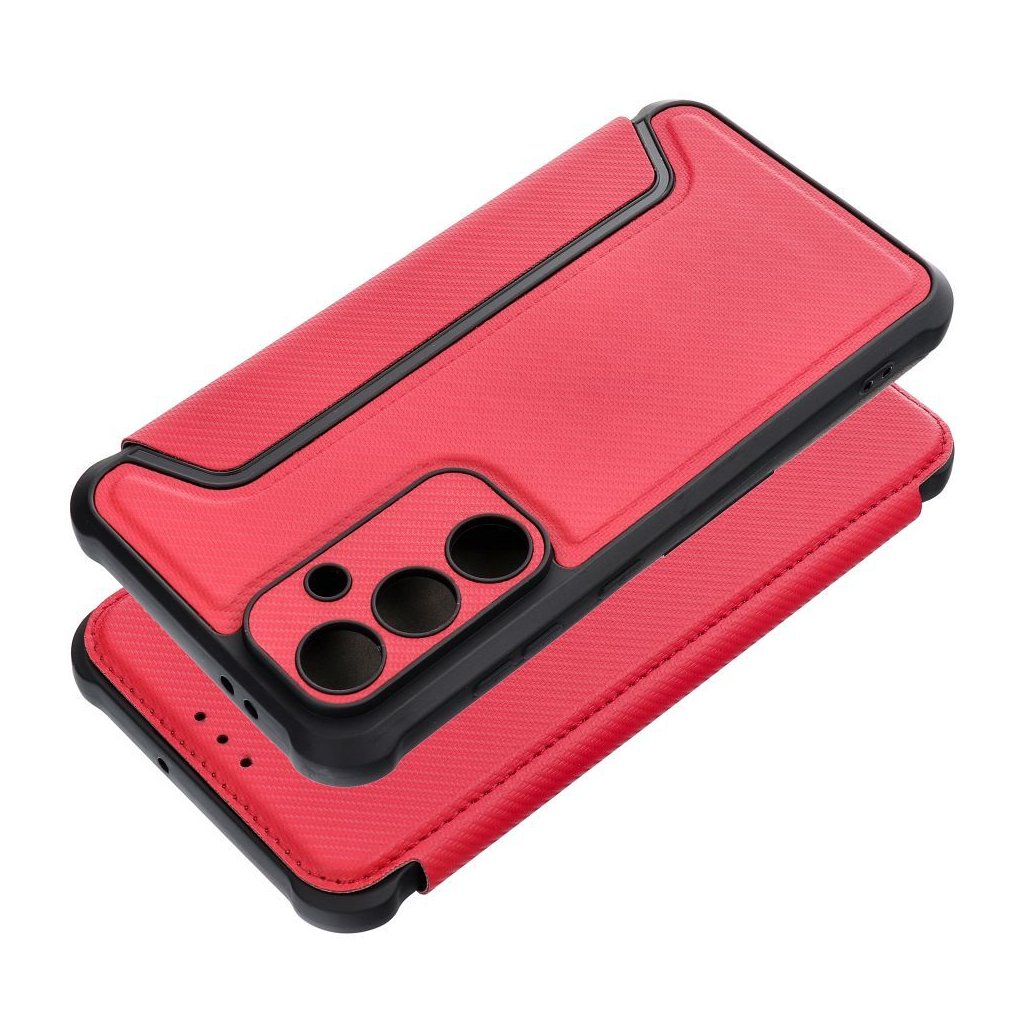 Luxusné zatváracie Puzdro RAZOR Book pre SAMSUNG S24 FE červené je zárukou bezpečného používania telefónu v prestížnom štýle. Zosilnené okraje, mäkké vnútro a magnetické zapínanie chráni mobil pred poškriabaním a nárazmi.