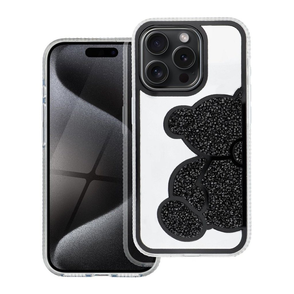 Elegantný kryt na mobil TEDDY BEAR pre IPHONE 16e (SE 4 2025) čierny ktorý sa vyznačuje charakteristickým trblietavým vzorom medvedíka, vyvýšenými okrajmi a plastom.
